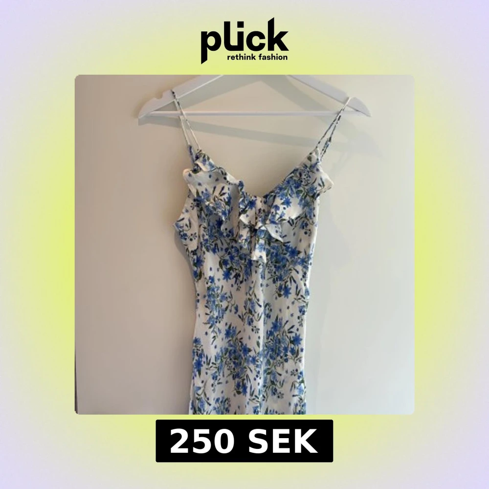 Säljer en superfin långklänning med smala axelband och volangdetalj upptill. Klänningen är vit med blått blommigt mönster och har en figurnära passform. Perfekt för sommarens alla tillfällen, riktigt fräsch och romantisk vibe.