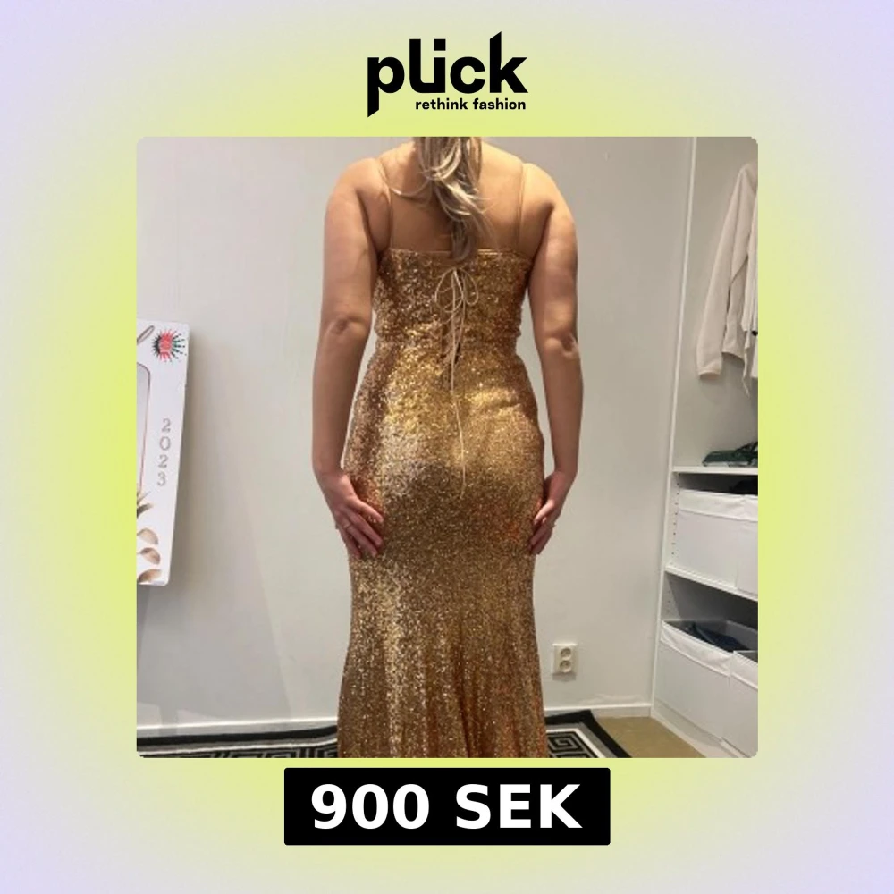 Säljer en glittrig guldig långklänning med figurnära passform och snörning i ryggen. Klänningen har axelbandslös design och är täckt av paljetter som ger en lyxig känsla. Perfekt för bal eller festliga tillfällen.