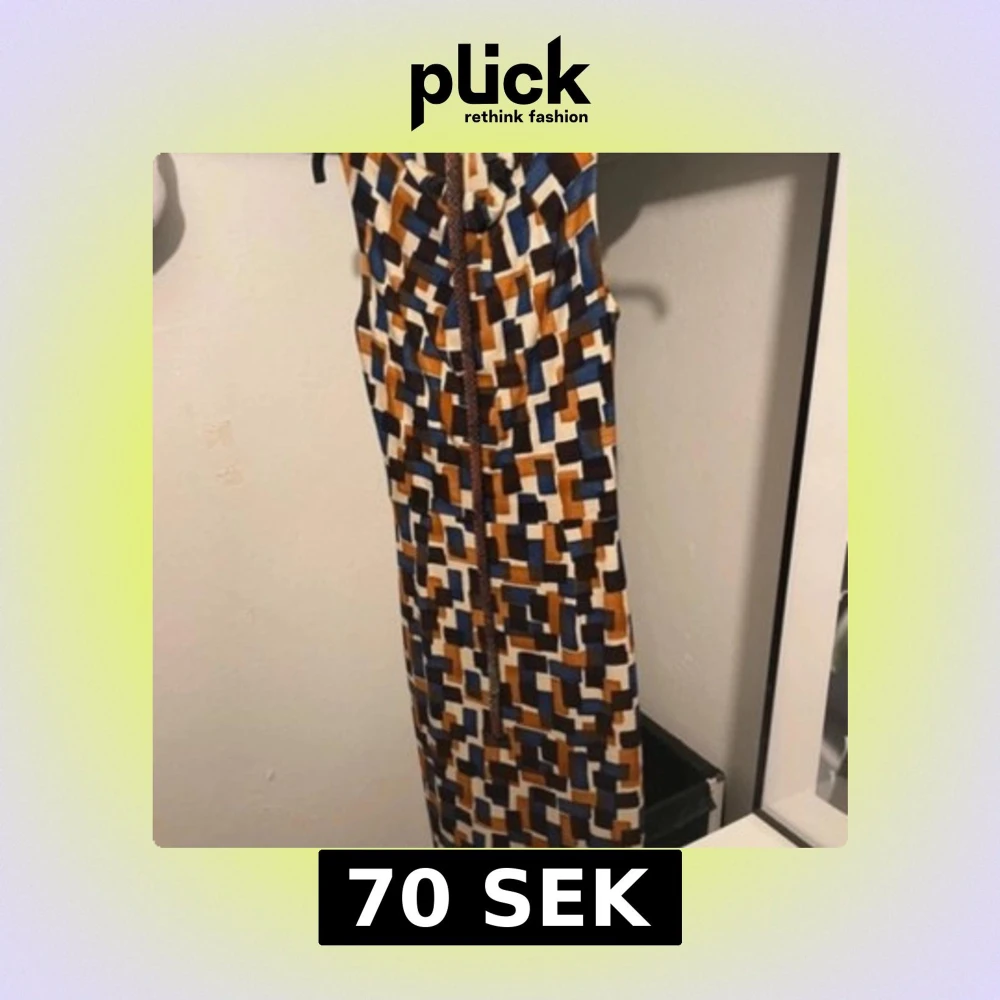 Säljer en långklänning med coolt geometriskt mönster i blått, brunt, orange och vitt. Klänningen har en figurnära passform och knytning upptill. Perfekt för dig som gillar unika och färgstarka plagg!