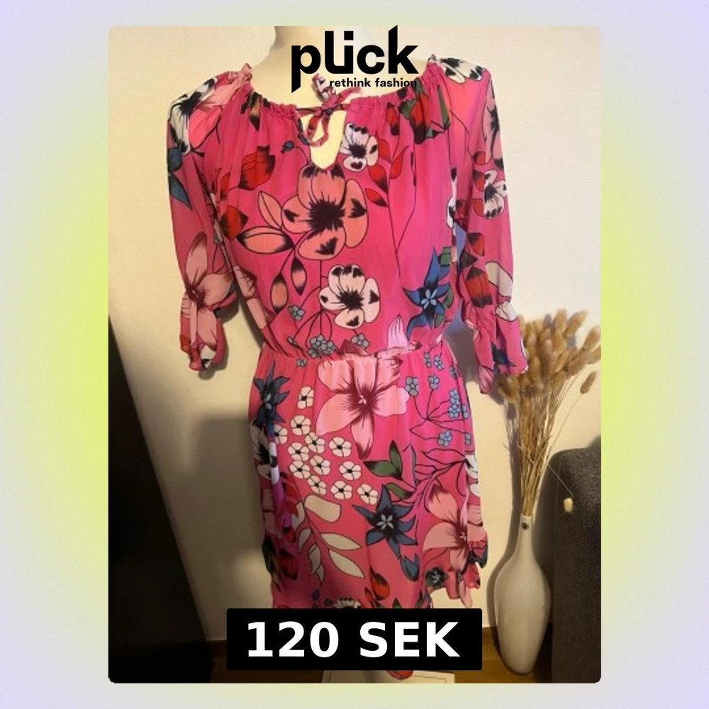Snygg rosa kortklänning med färgglatt blommönster och trekvartsärmar. Klänningen har en söt knytning vid halsen och resår i midjan för en bekväm passform. Perfekt för dig som gillar färg och vill sticka ut. Storlek s/m. Finns små skvanker
