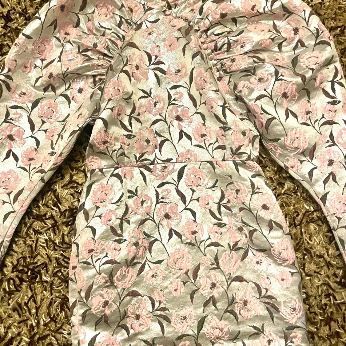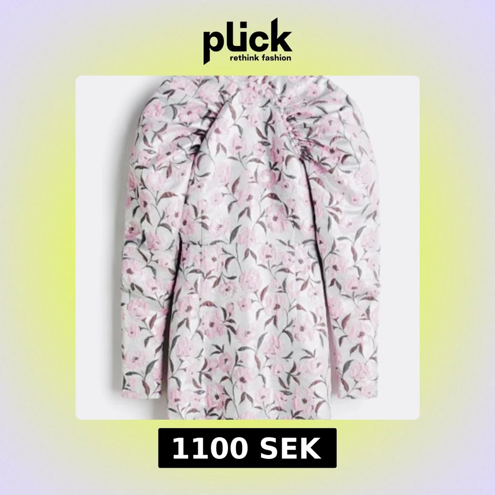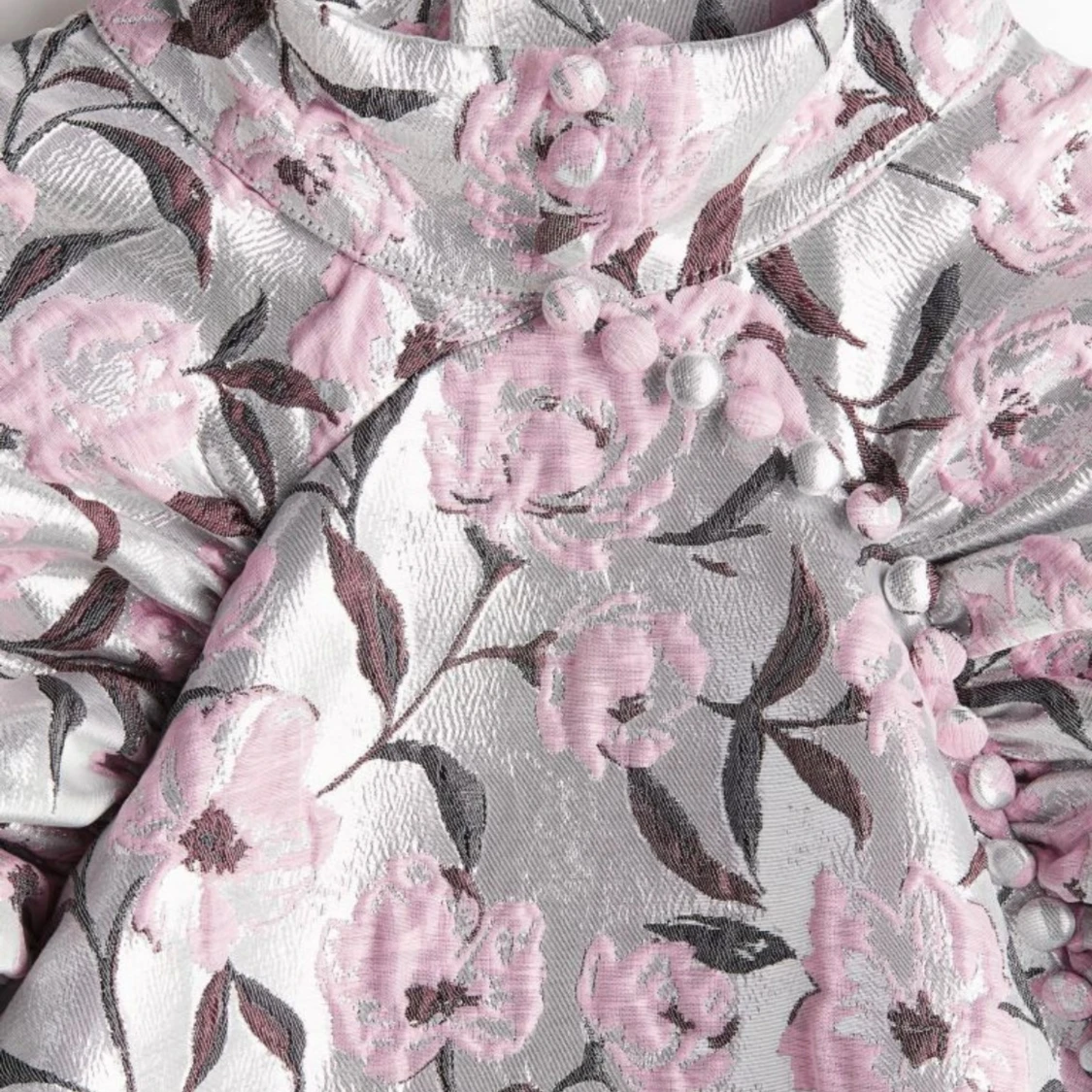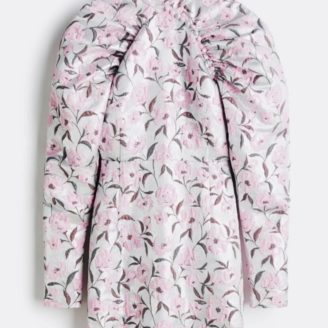 Elegant klänning med ett vackert blommönster i rosa och grått. Klänningen har långa puffärmar och en hög hals med knappar som detalj. Perfekt för en stilfull look.