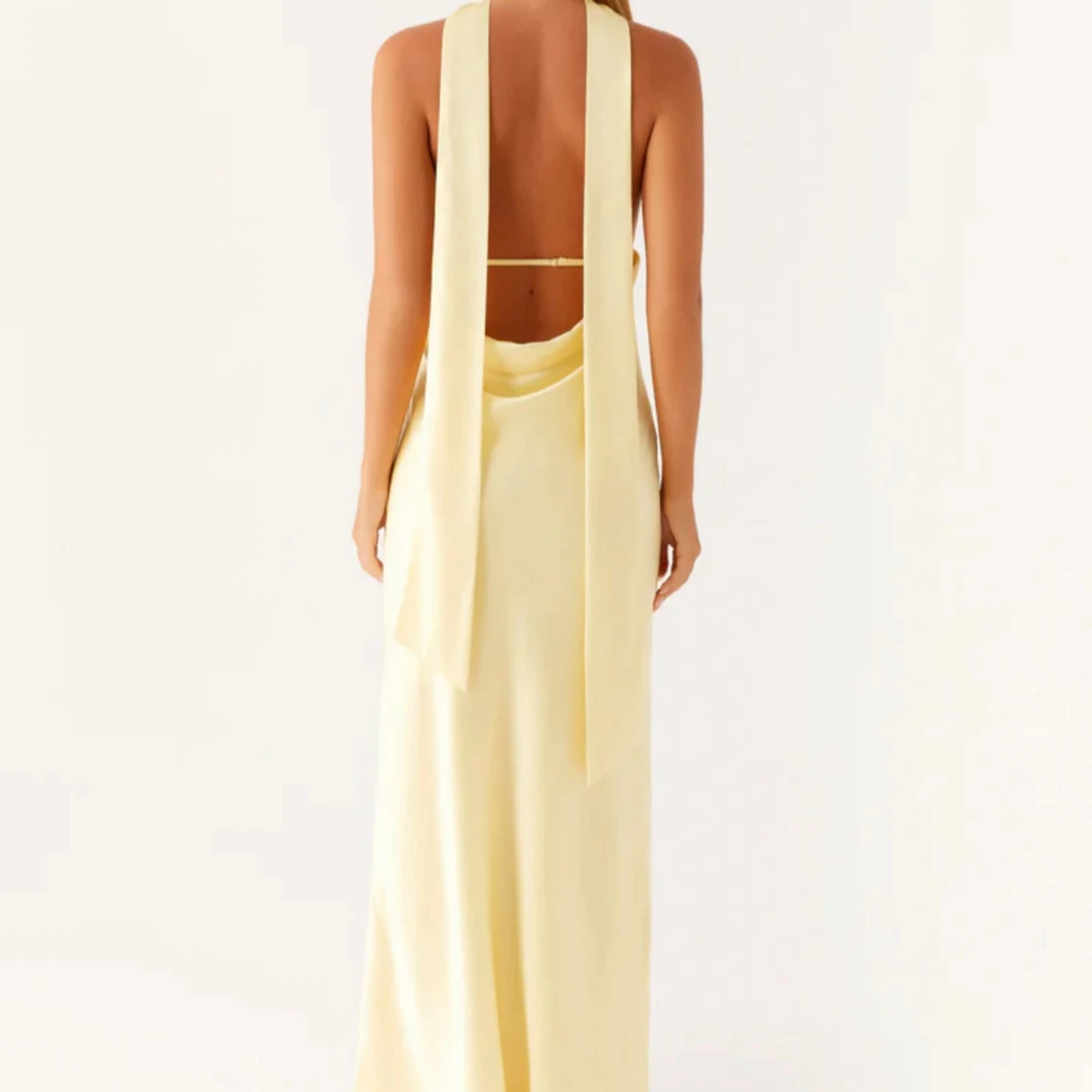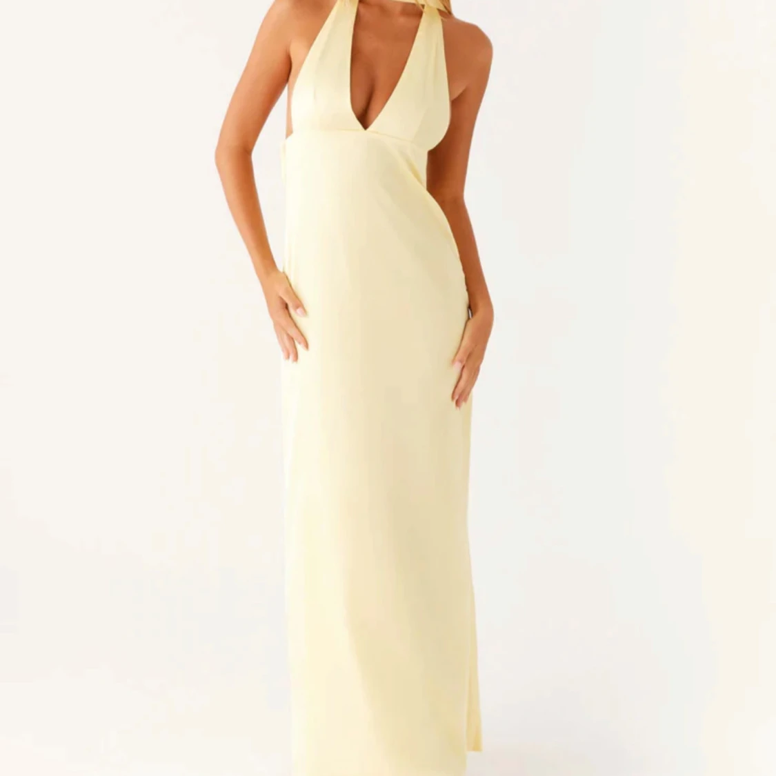 Säljer en elegant ljusgul långklänning med djup v-ringning och öppen rygg. Klänningen har halterneck och långa band som knyts i nacken. Perfekt för sommarens alla tillfällen! Den är från peppermayo, säljer då den inte hann komma i tid till min bal. Såå fin klänning!