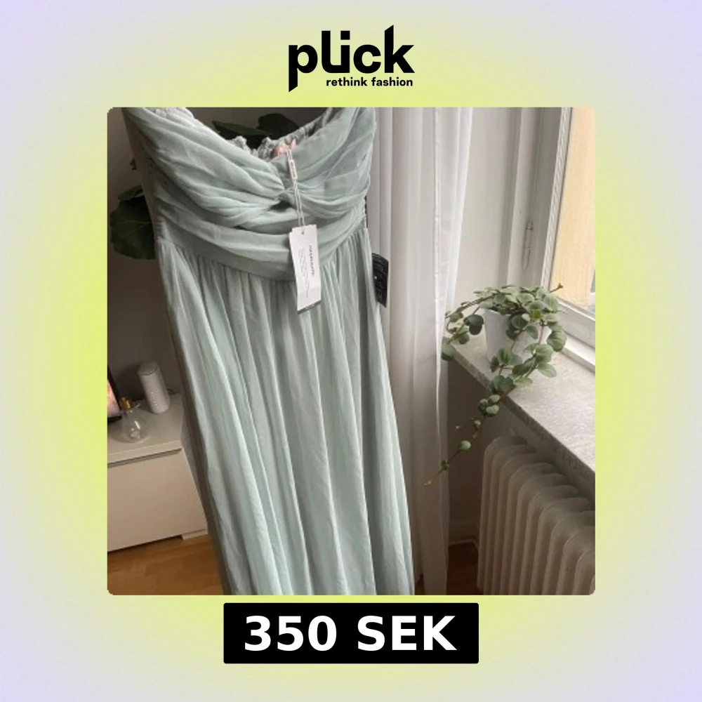 Festlig ljusgrön långklänning från NLY Eve med axelbandslös design och draperad överdel. Klänningen har en flowy kjol och stängs med dragkedja i ryggen. Perfekt för bal och bröllop! Materialet känns lätt och elegant. Aldrig använd, lappar kvar