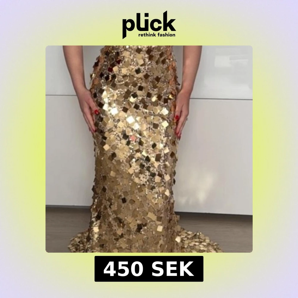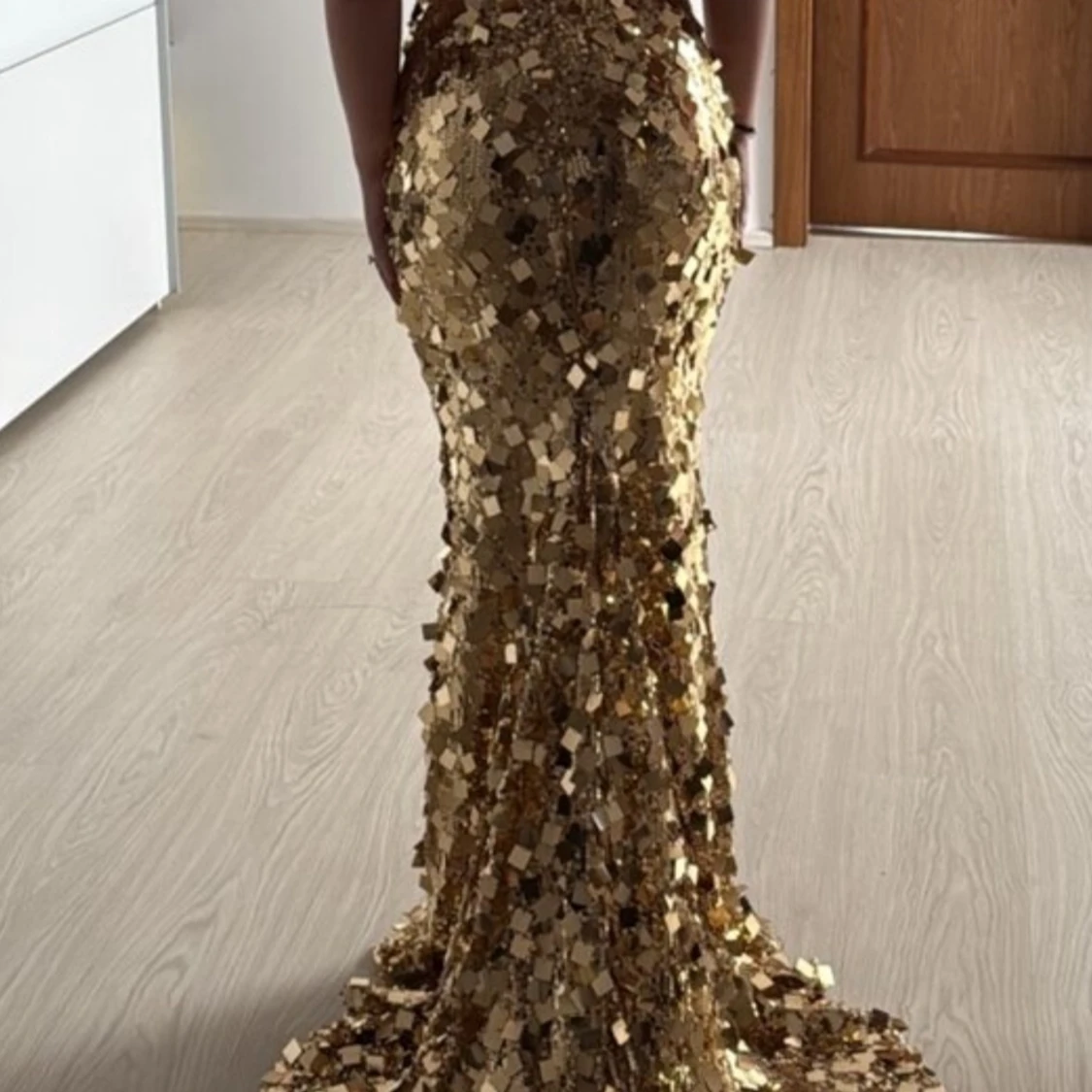 Säljer en maxad långklänning i guld med glittriga paljetter över hela klänningen. Klänningen har en figurnära passform och sveper snyggt längs golvet. Perfekt för dig som vill sticka ut och glänsa på bal eller fest. Materialet är syntet med stora paljettdetaljer.