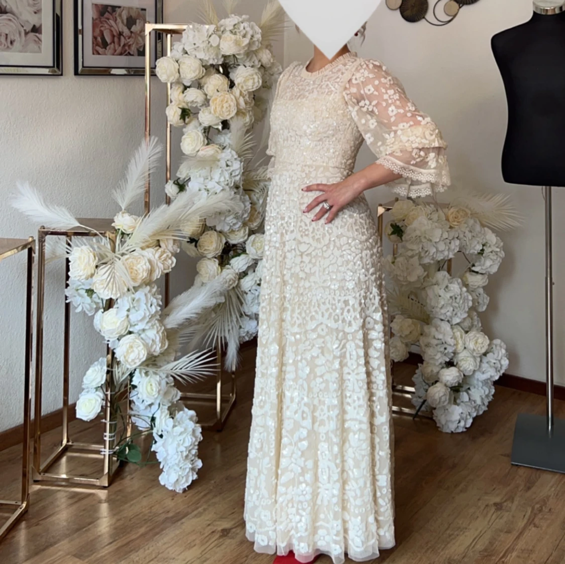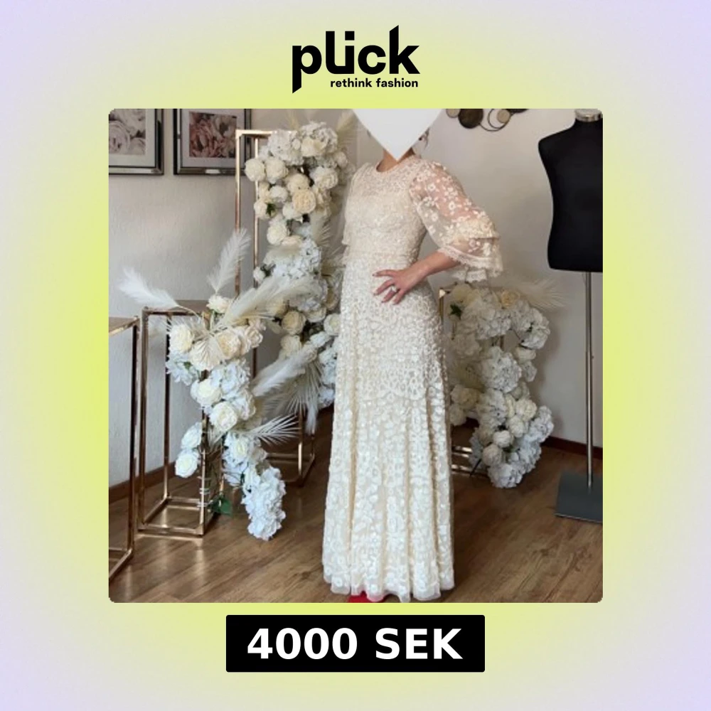 Benvit långklänning med blommigt spetsmönster och puffärmar. Klänningen har rund halsringning och vackra detaljer över hela tyget, perfekt för speciella tillfällen som t.ex fester eller bal. Köpt för 10 000kr och har endast använts vid två tillfällen och är därav i nytt skick. Skriv vid andra frågor.