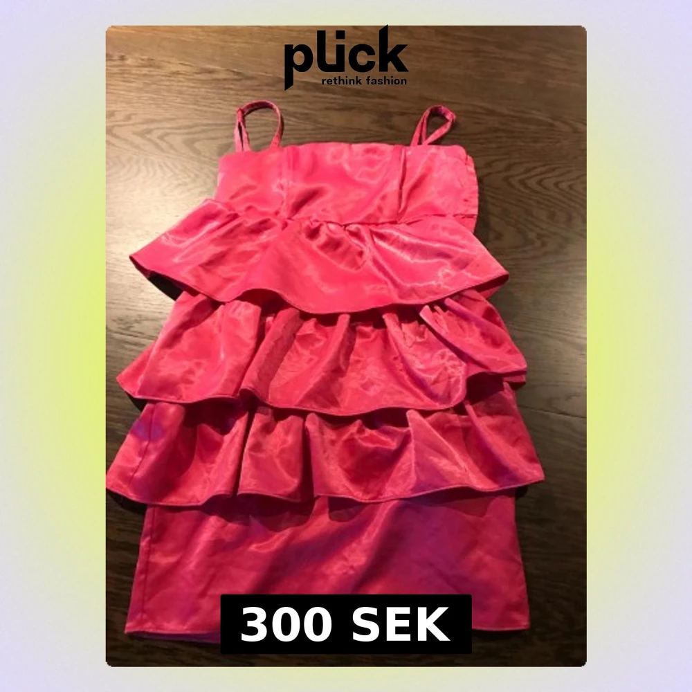 Säljer en kort rosa klänning med tunna avtagbara axelband och flera lager volanger framtill. Materialet har en lätt glansig finish. Klänningen är i storlek 36, men jag skulle säga att den är liten i storleken.