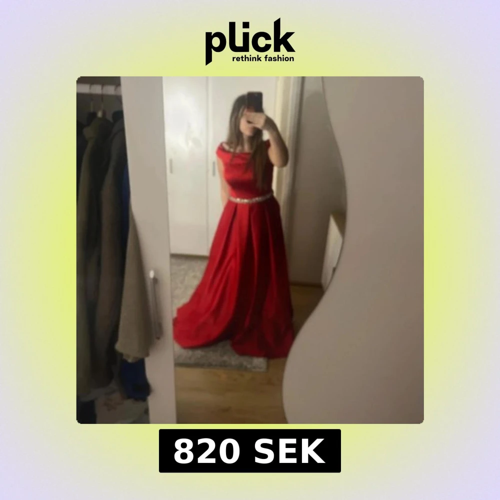 Säljer en röd långklänning med offshoulder-modell och glittrigt bälte i midjan. Klänningen har en elegant, vid kjol och markerad midja. Perfekt för bal eller festliga tillfällen. Materialet känns slätt och faller snyggt.