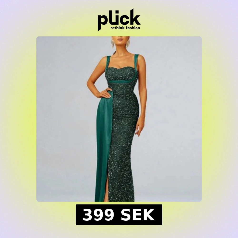Supersnygg grön långklänning från Miss Ord med glittriga paljetter och breda axelband. Klänningen har en figurnära passform, slits framtill och en elegant detalj i satin längs sidan. Perfekt för bal eller festkvällar när du vill sticka ut.