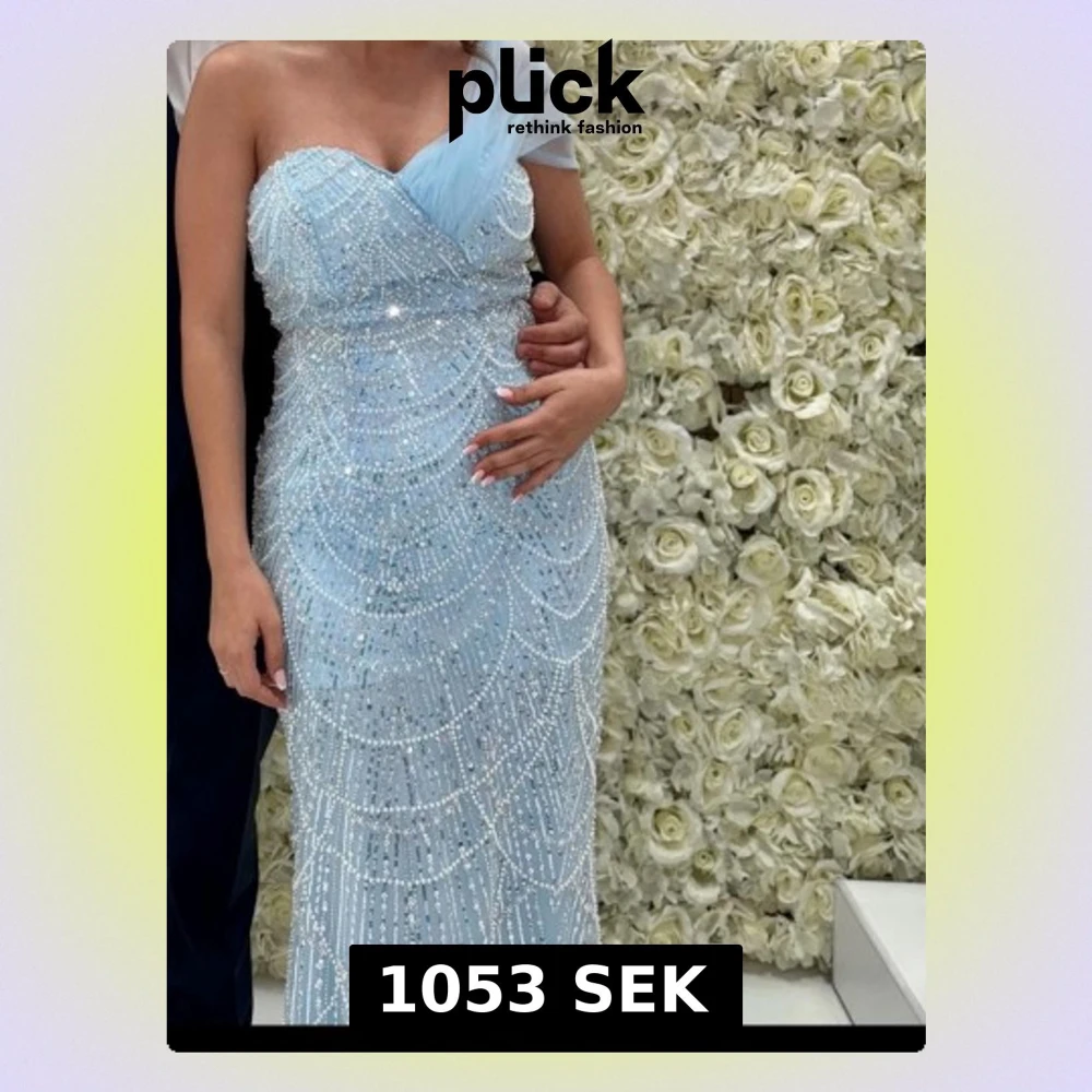 Säljer en ljusblå långklänning med glittriga paljetter och pärldetaljer. Klänningen har ett axelbandslöst snitt med en transparent tyll över ena axeln. Perfekt för bal eller fest, med ett elegant och lyxigt utseende.