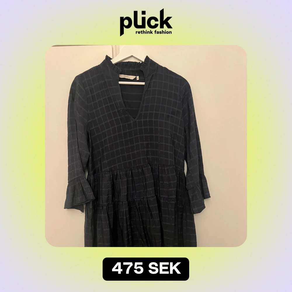 Säljer en mörkblå klänning med rutigt mönster. Den har en v-ringad hals och trekvartsärmar med volangdetaljer. Knälång! Perfekt för höst och vår, och passar både till vardags och festligare tillfällen. Nypris 1100kr