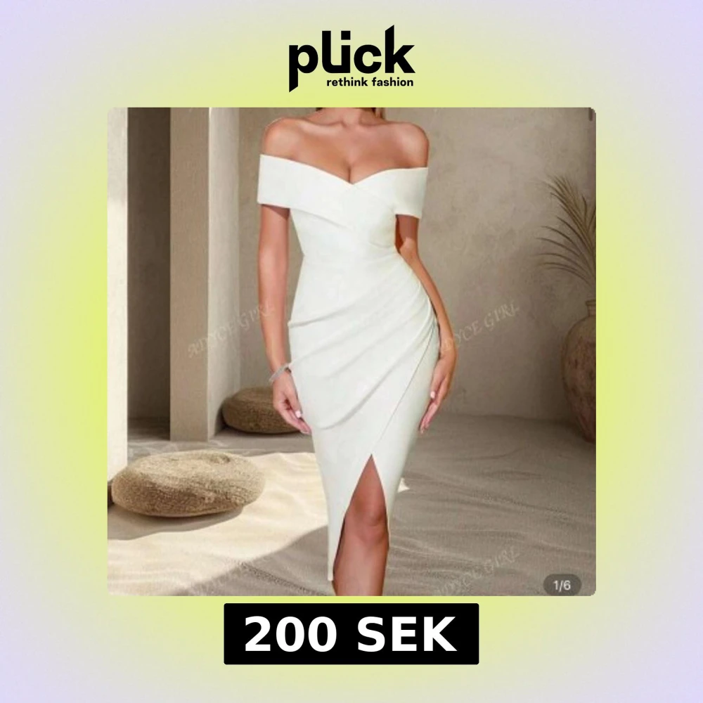 Elegant vit offshoulder klänning med en smickrande omlott-design och slits framtill. Passar perfekt till studenten! Den är i storlek XS-S och har bara använts en gång, så den är i nyskick