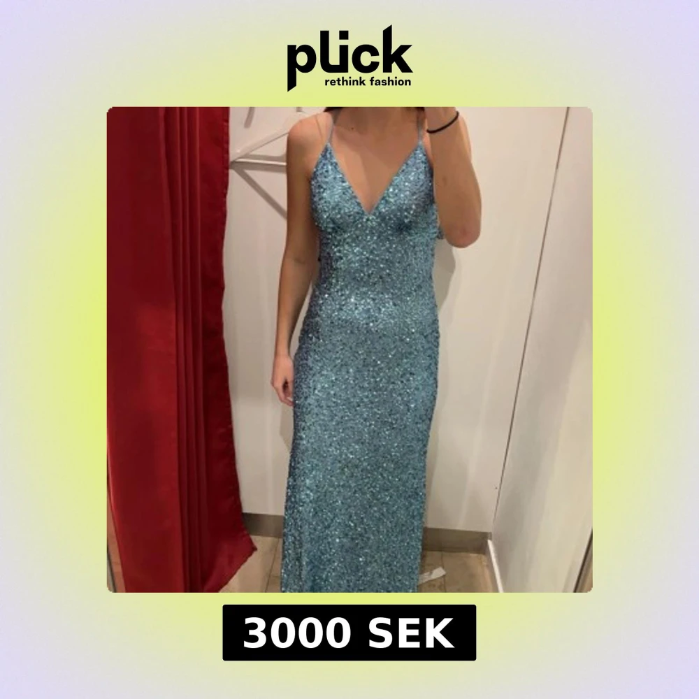 Snygg blå glittrig balklänning med smala axelband och v-ringning. Klänningen har en öppen rygg med korsade band och lite släp! Endast använd en gång! Köpt på L&S butiken i Göteborg. Ursprungspris: 3800 kr, kom privat för fler bilder🥰Köparen står för frakt