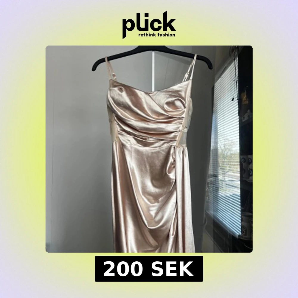 Säljer en elegant långklänning i skimrande champagnefärgat satin med smala axelband och draperad framsida. Baksidan har meshparti med broderade detaljer i guld. Perfekt för bal eller fest! (Använt en gång)