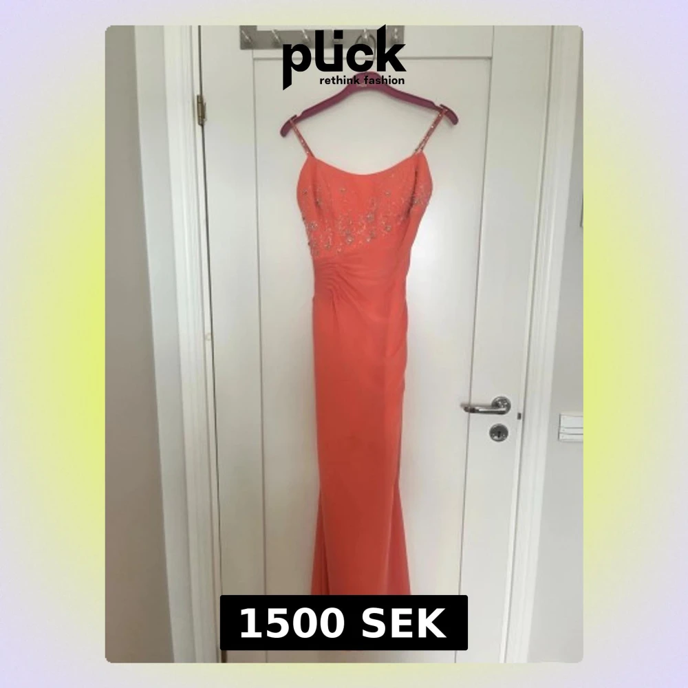 Elegant långklänning i korall med smala axelband och vacker pärl- och paljettbrodyr över bysten. Klänningen har figurnära passform och lätt drapering vid midjan. Jättefin till bal eller annan fest! Passar 34-36. Köpt för 3000kr. Nyskick!