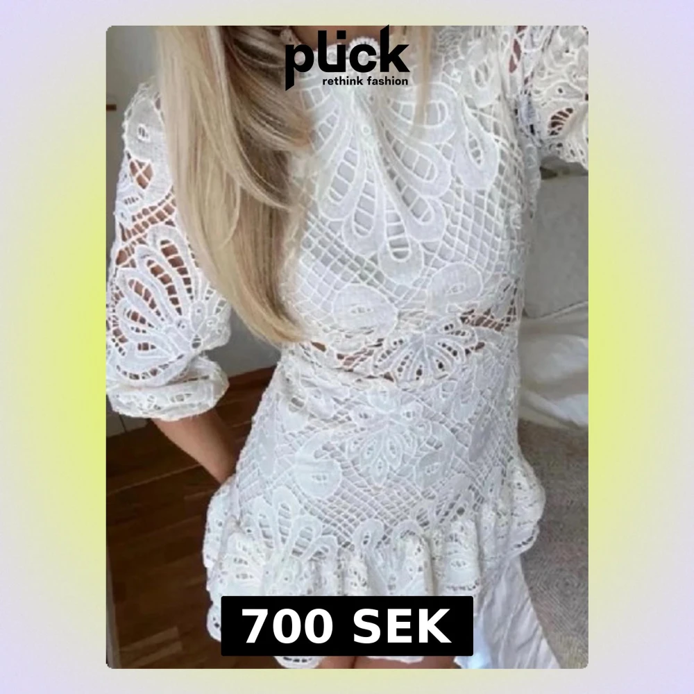 Supersnygg vit kortklänning i spets med volangkant och genombrutet mönster. Klänningen har långärmade puffärmar, hög hals och markerad midja. Perfekt för studenten😍
