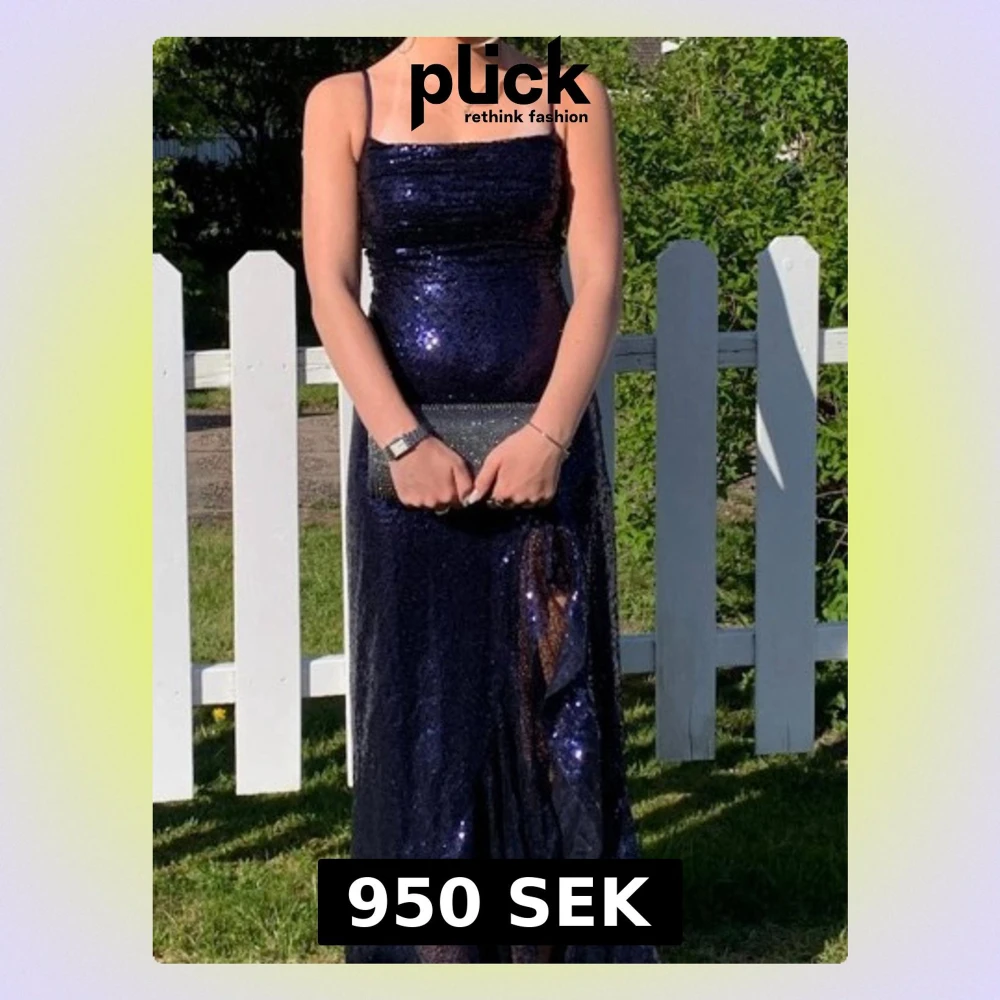Fin marinblå klänning endast använd under några timmar så i absolut toppskick! Paljetter över hela, slits fram på sidan, korsettsnörning i ryggen samt dragkedja över dumpande gör att den kan passa lite olika kroppsformer och storlekar. Kommer från JJ’s och är i storlek S.