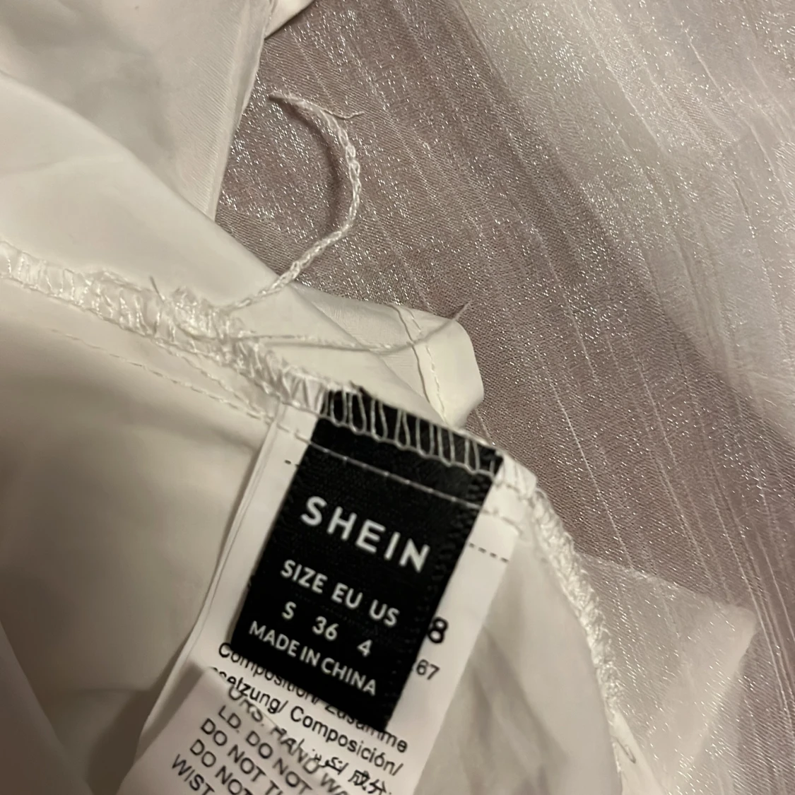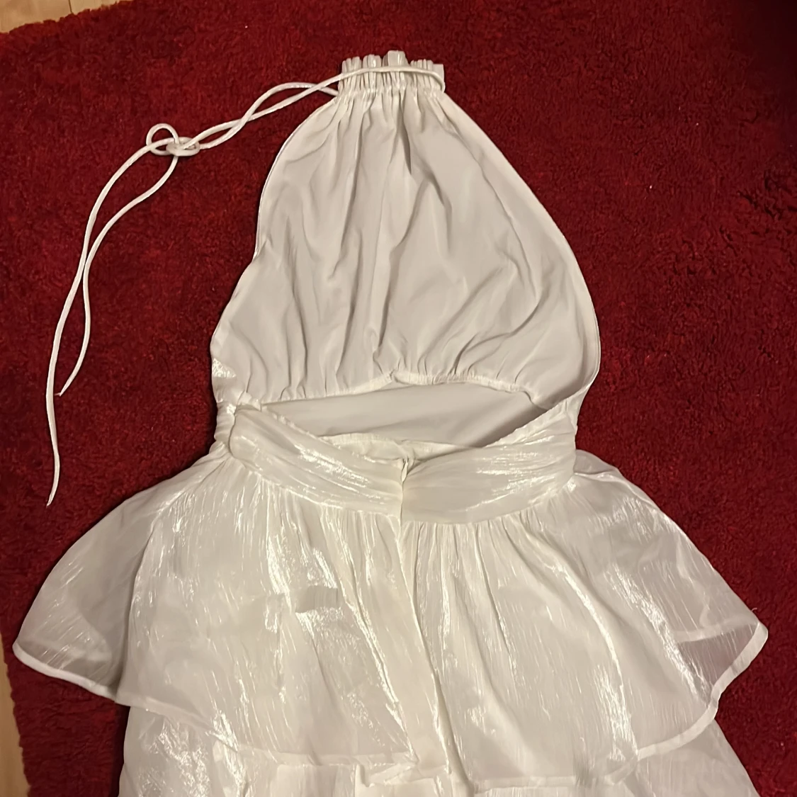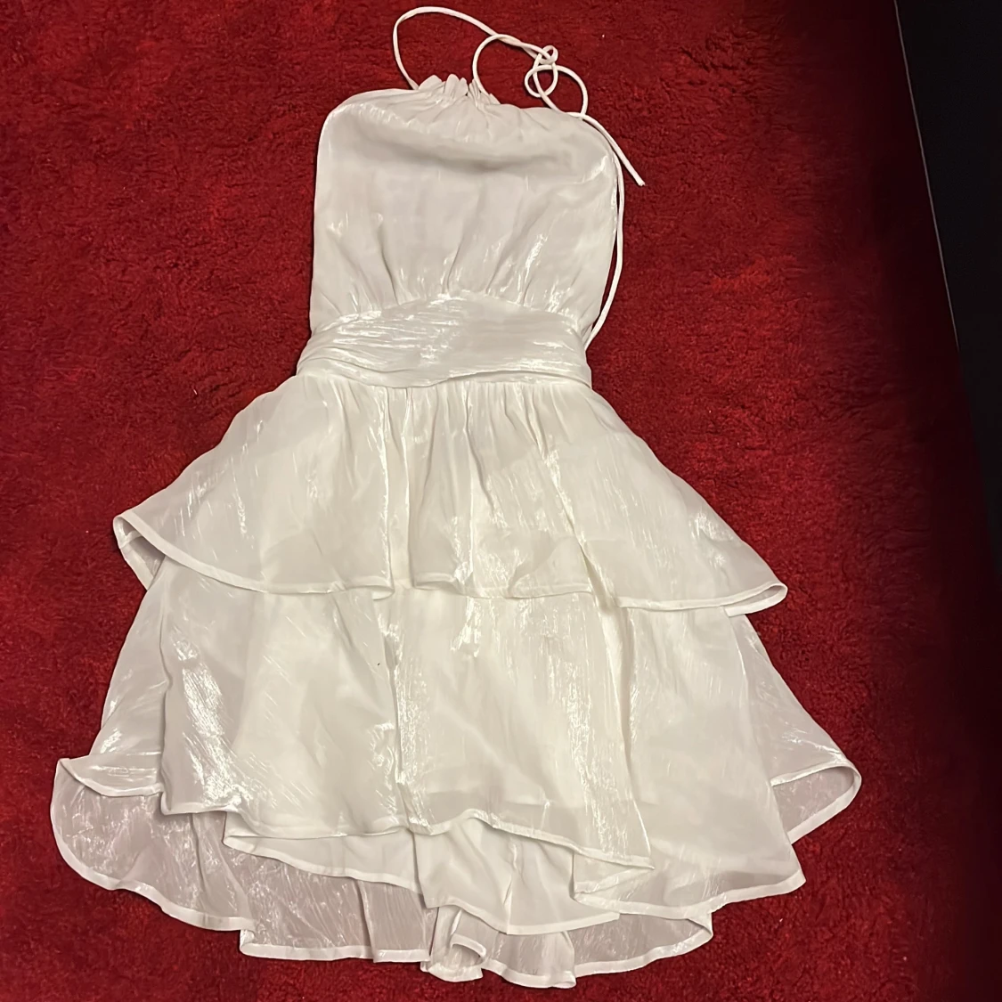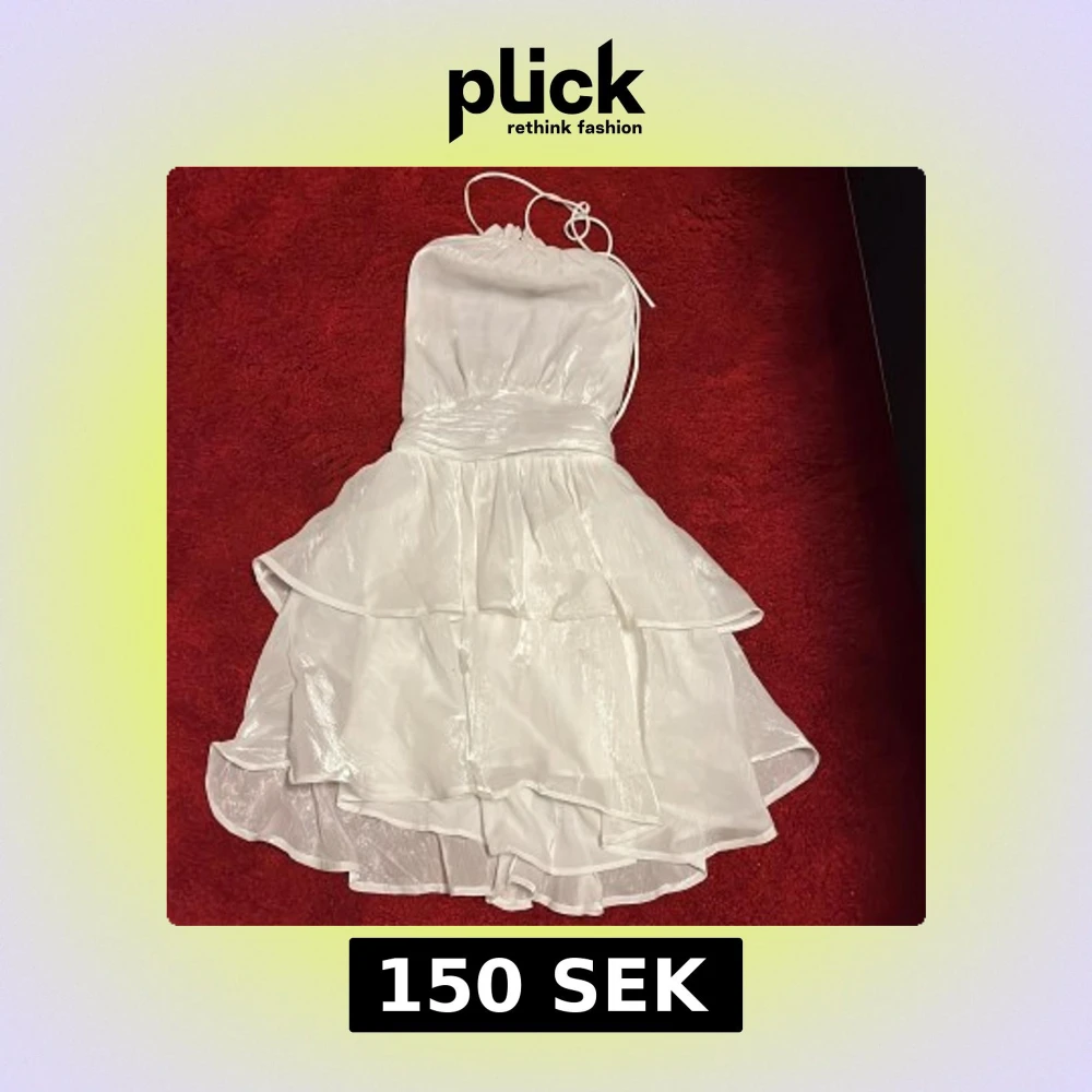 Säljer en vit axelbandslös klänning i storlek 36/S med volanger och glansigt material💖✨🪩Klänningen har en kort längd och knytband vid halsen. Perfekt för sommarens festligheter såsom student, midsommar och liknande!🥳🎓