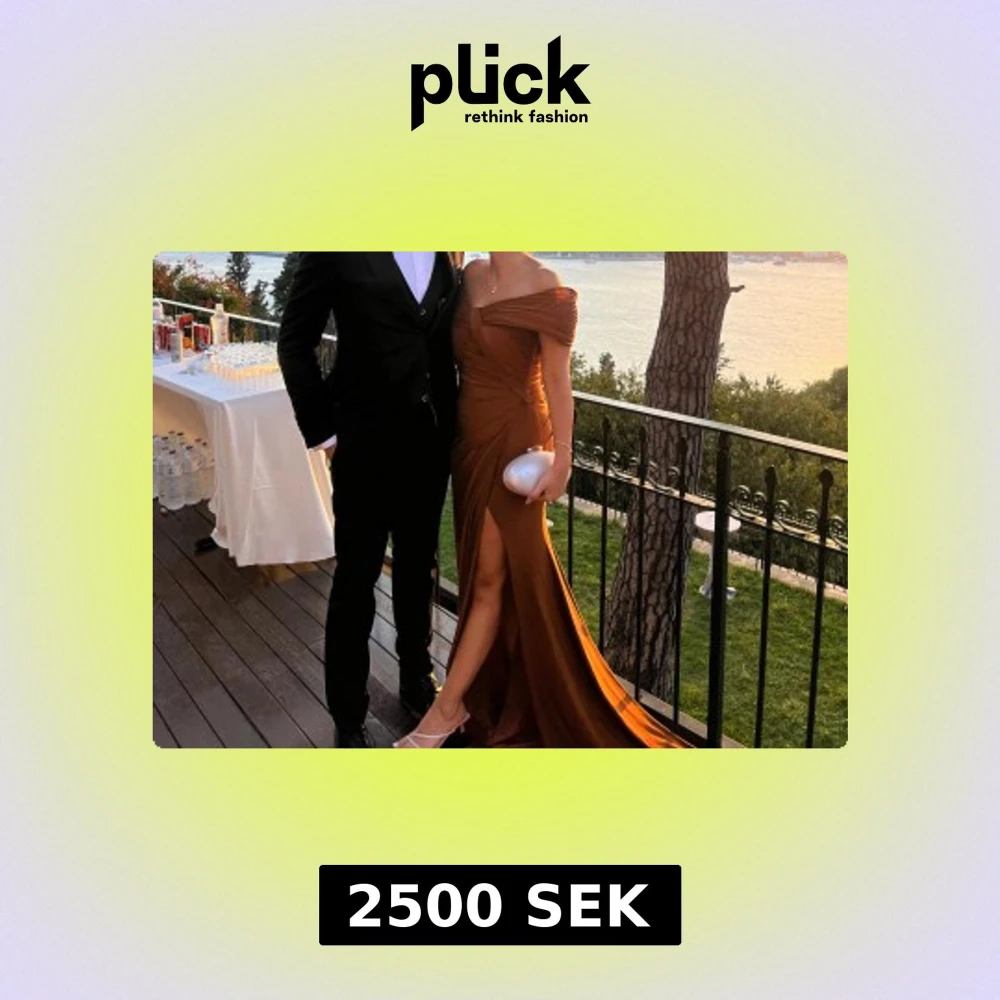 Säljer en elegant brun långklänning med offshoulder och draperad överdel. Klänningen har en snygg slits framtill och markerad midja, vilket ger en riktigt lyxig känsla. Perfekt för bal eller festliga tillfällen.