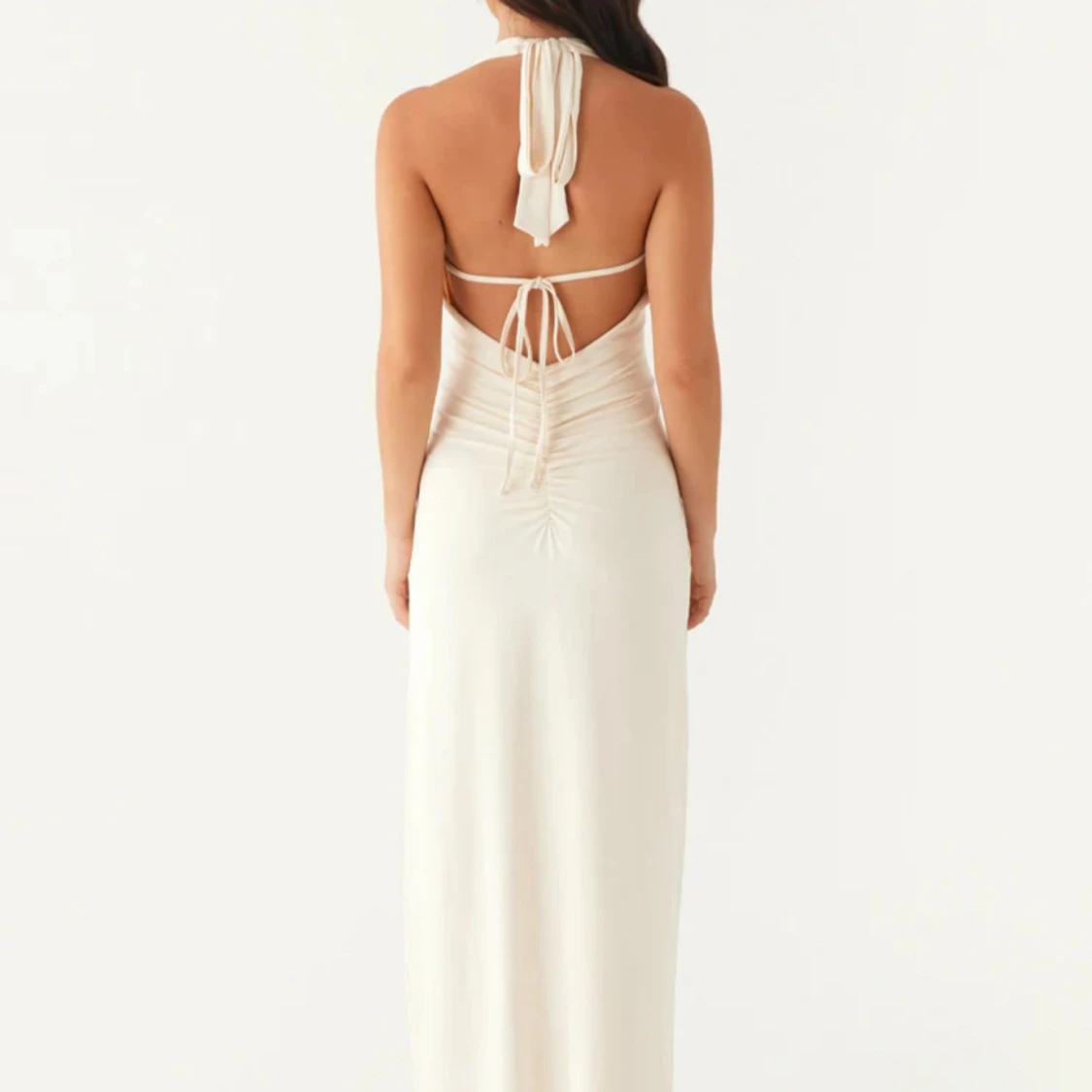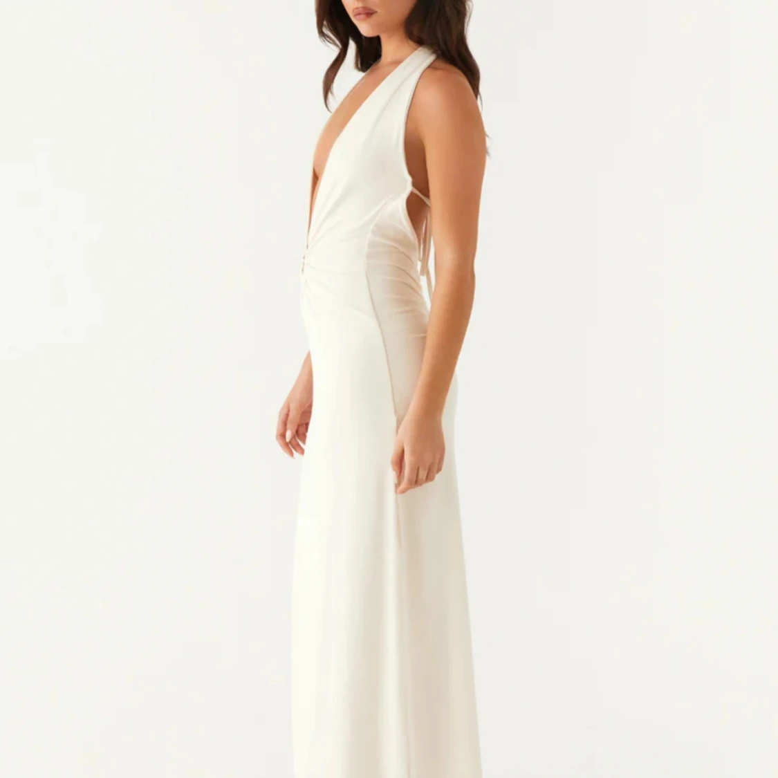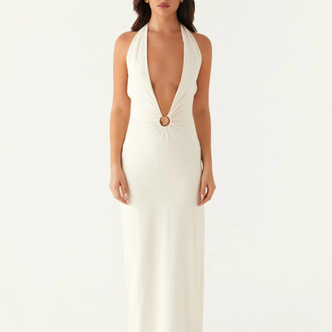 Supersnygg vit långklänning med djup v-ringning och halterneck. Klänningen har en dekorativ ringdetalj framtill, öppen rygg och knytband i nacken och ryggen. Materialet är mjukt och följsamt, perfekt för sommarkvällar eller speciella tillfällen.