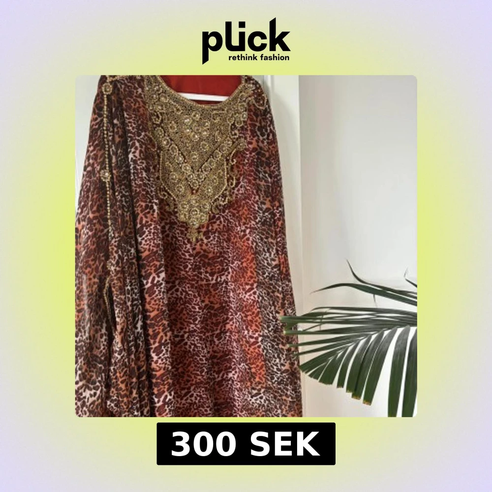 Säljer en maxad långklänning med leopardmönster i bruna och beige toner. Klänningen har en riktigt snygg och detaljerad guldfärgad brodyr och pärlutsmyckning upptill. Perfekt för dig som vill sticka ut och älskar statement-plagg!