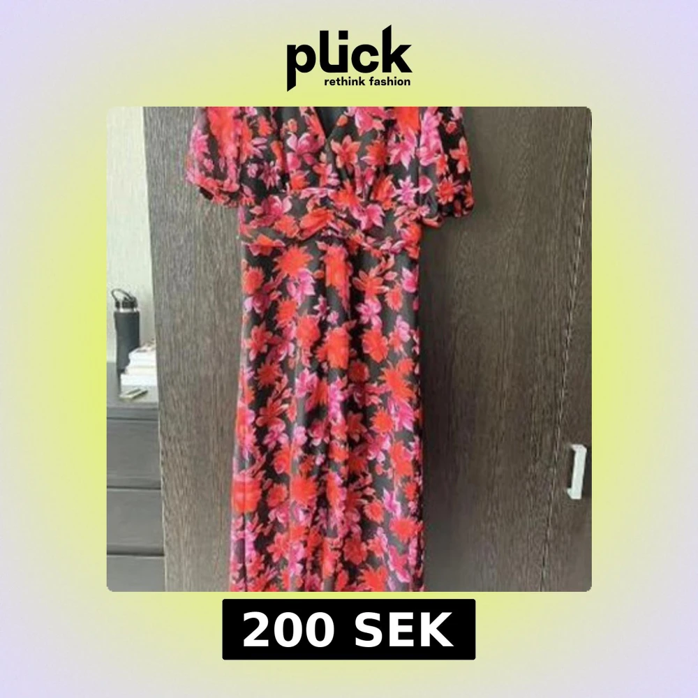 Säljer en färgglad blommig klänning från Kiabi. Klänningen har en v-ringad design med korta ärmar och ett vackert blommönster i rött och rosa på en svart bakgrund. Perfekt för en somrig look! 🌸