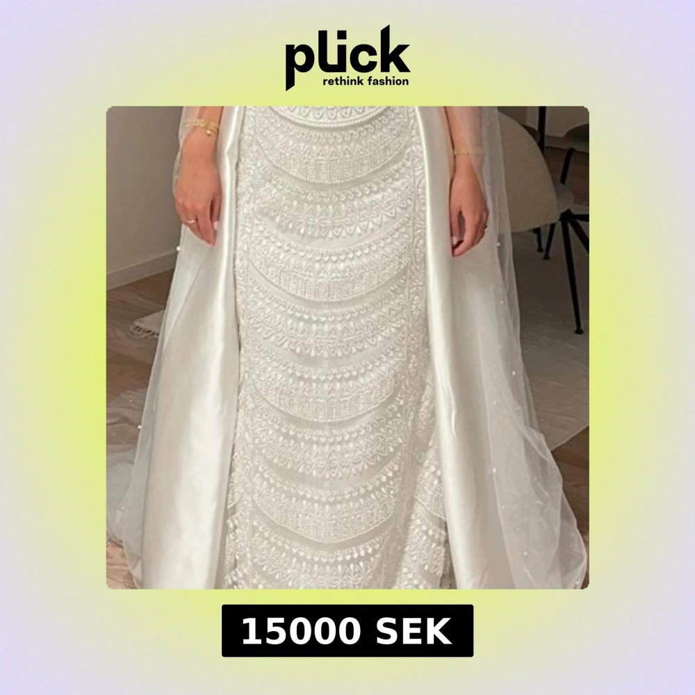 Elegant vit brudklänning med vackra broderade mönster och pärldetaljer. Klänningen har en klassisk siluett med ett skirt släp. Perfekt för dig som vill sticka ut med en tidlös och lyxig look till din bröllopsdag. Säljs för att jag köpt flera brudklänningar och hann aldrig använda denna. Överkjolen är avtagbar. Finns i Göteborg för att testa och köpa. Pris går att diskutera vid snabb affär. Helt ny klänning aldrig använd. Den passar också en 36. Nypris 23 000kr.