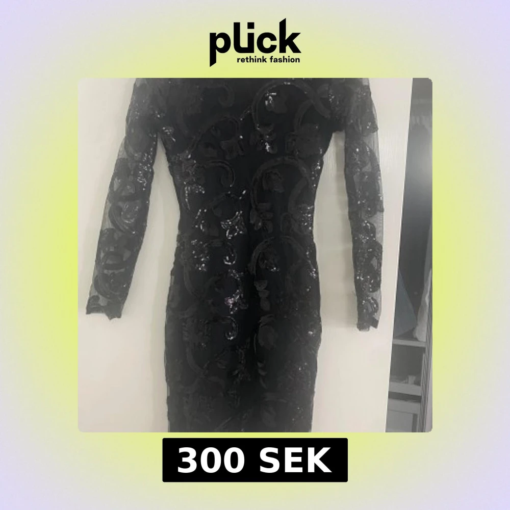 Snygg svart klänning med glittriga detaljer och långärmad design. Den går att stänga hela vägen men tyvärr tight på mig därför ser det ut som att den är öppen, klänningen har en tight passform som framhäver figuren. Perfekt för en festkväll!