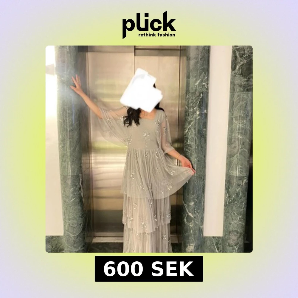 Elegant ljusgrå långklänning med lager på lager-kjol och vackra pärlbroderier. Klänningen har v-ringning, vida trekvartsärmar och ett flowy fall som ger en drömmig känsla. Perfekt för dig som vill sticka ut med en romantisk och sofistikerad look. Handmade dessutom