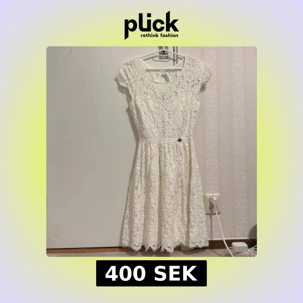 Superfin vit spetsklänning från Chiara Forthi med kort ärm och rund halsringning. Klänningen har öppen rygg och markerad midja med en liten metallogo framtill. Blommigt spetsmönster och lätt utställd kjol ger en romantisk känsla. Perfekt till student/skolavslutning. ALDRIG ANVÄND!! Ska lägga upp fler klänningar så håll utkik!