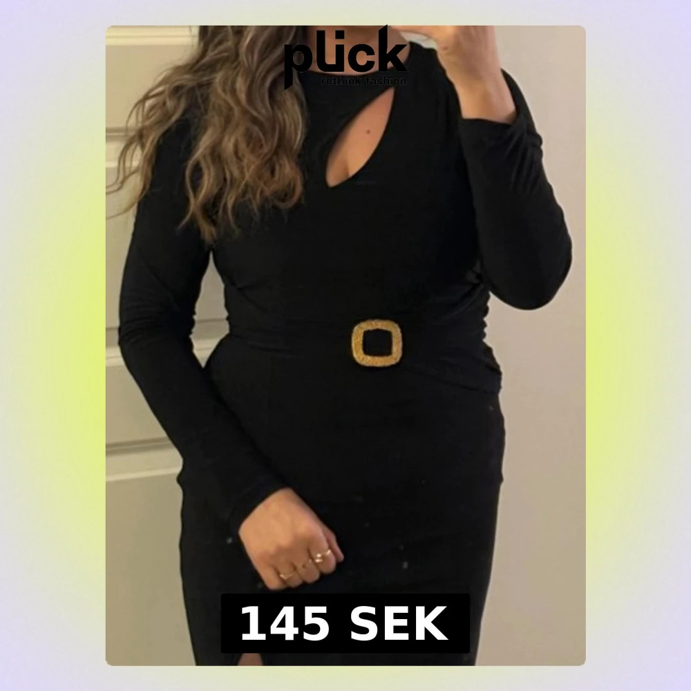 Snygg svart långärmad klänning med ett dekorativt guldspänne i midjan och en liten cut-out vid halsen. Klänningen har en slits framtill och är figurnära i modellen. Perfekt för dig som vill ha en elegant och stilren look.