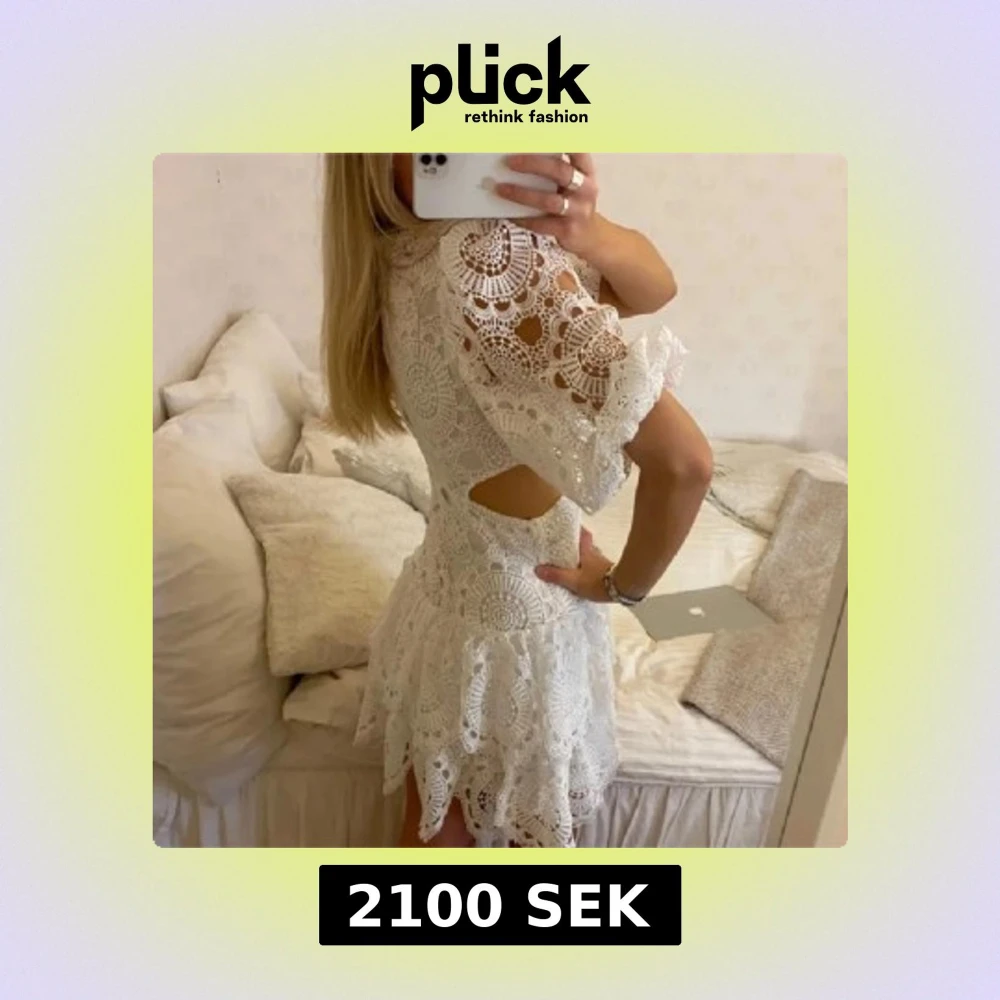 Superfin vit kortklänning i spets med volangdetaljer och öppning i sidan. Klänningen har korta ärmar och vackert broderat mönster som ger en romantisk känsla. Perfekt för sommarens alla tillfällen!