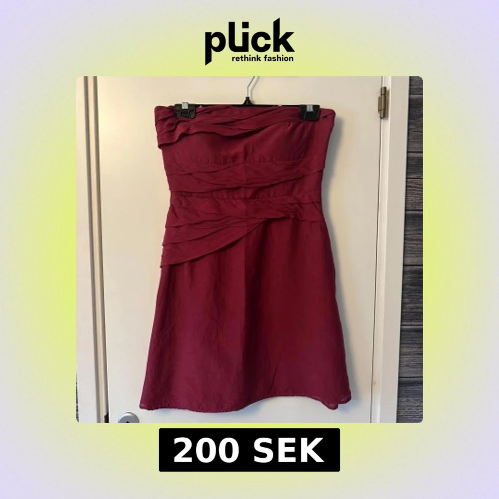 Elegant vinröd axelbandslös klänning från Paris Kate & I med draperade detaljer. Perfekt för festliga tillfällen.