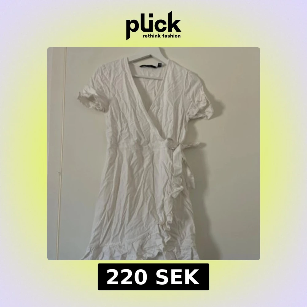 Säljer en söt vit omlottklänning med volangdetaljer. Klänningen har korta ärmar och en knytning i midjan för en smickrande passform. Perfekt för sommarens alla tillfällen!
