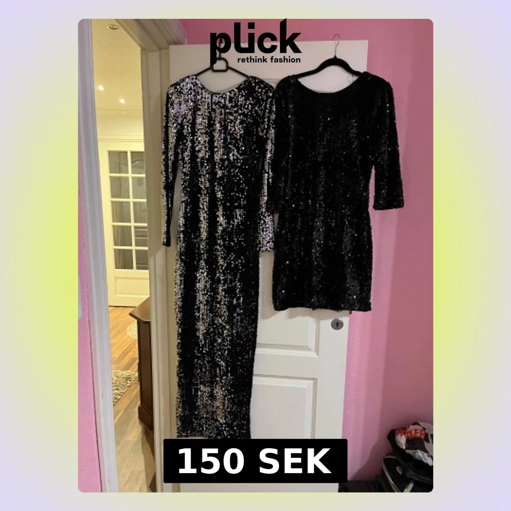 Säljer två svarta glittriga paljettklänning med rund hals och trekvartsärm. Klänningar är täckta av svarta paljetter som ger en riktigt snygg och festlig look. Passformen är normal och materialet känns som polyester. Perfekt för dig som vill sticka ut med lite extra bling. Den långa passar i storlek S och den korta passar i storlek XS.