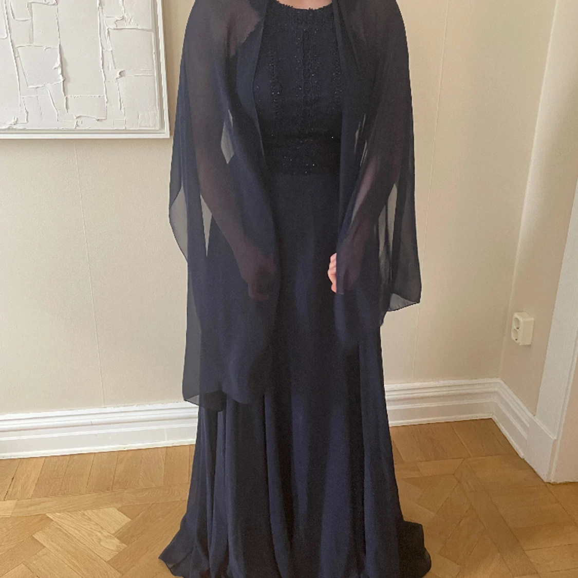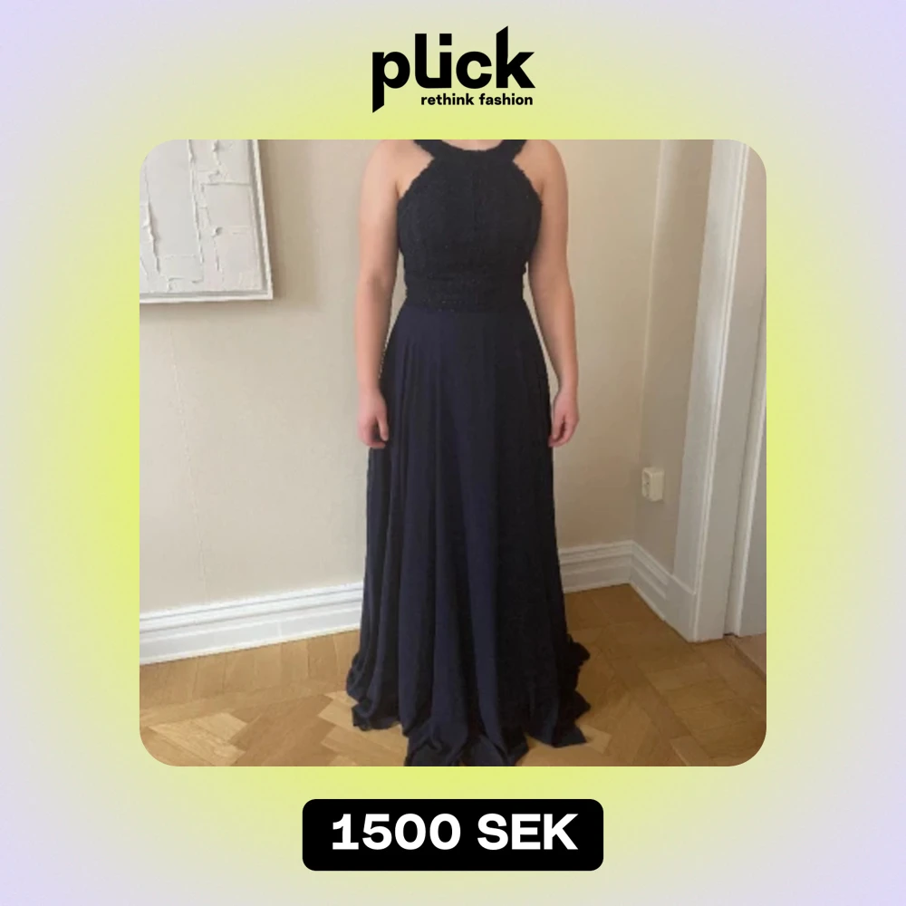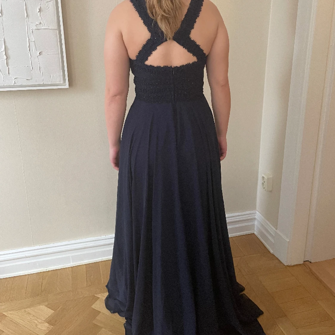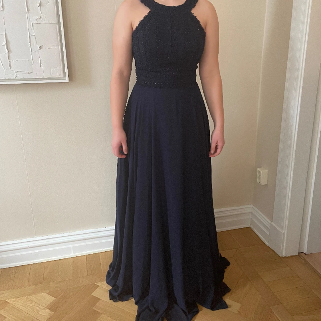 Säljer min syrras balklänning från Jora collection Mörkblå klänning med skrimrande stenar , inbyggd bh vilket gör att du inte behöver något annat stöd Storlek 38 Inköpt i Remmans högtider i Göteborg Aldrig använd pga corona Nypris 3500
