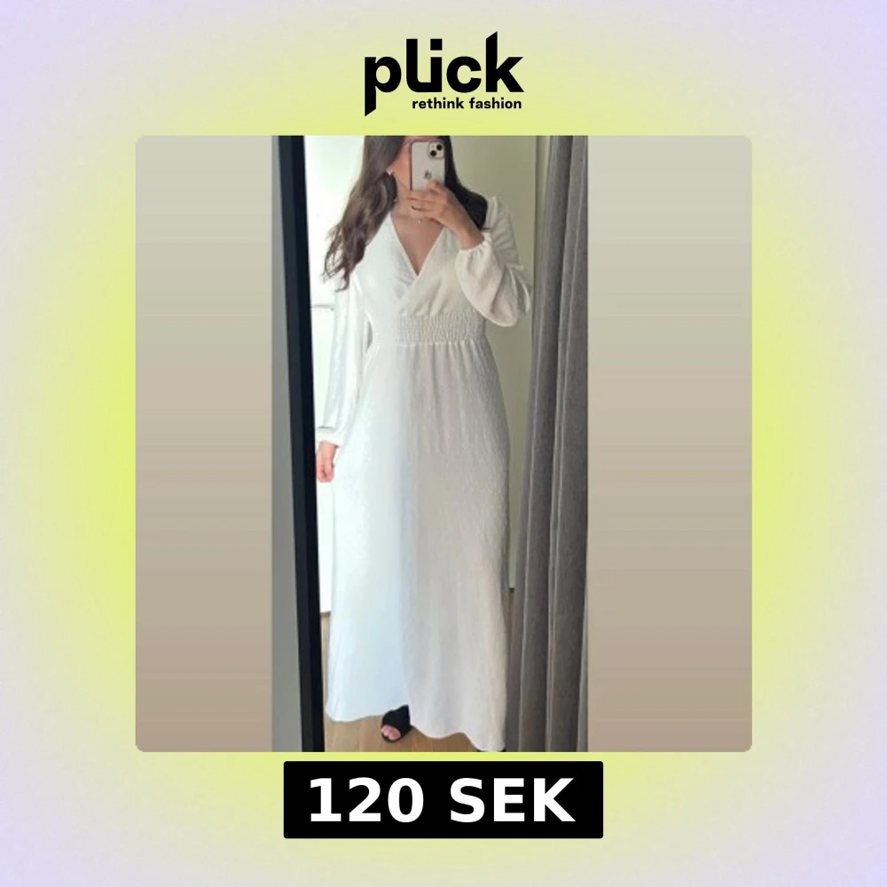 Superfin vit långklänning med omlott framtill och smock i midjan. Klänningen har långärmade ärmar och ett diskret prickigt strukturmönster i tyget. Härlig feminin sommarklänning som sitter fint på!