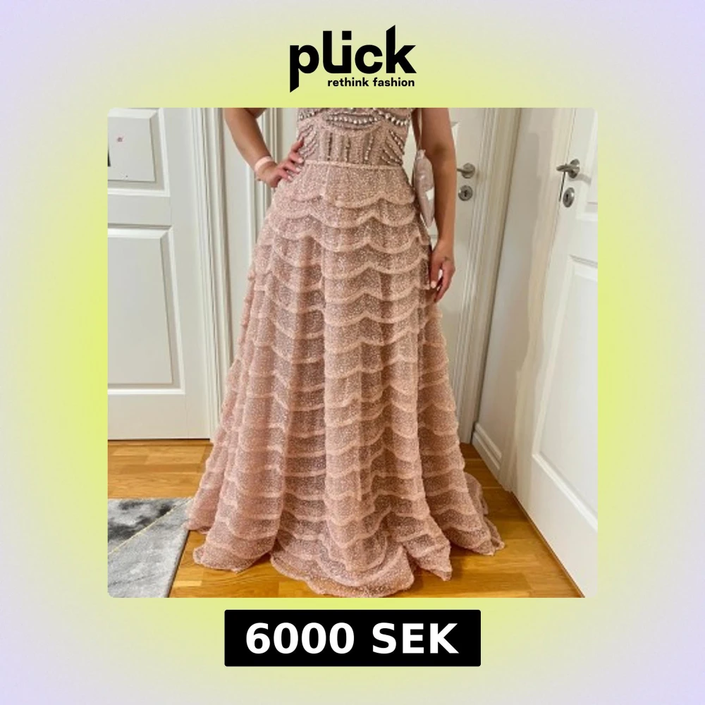 Superfin långklänning i champagnefärg med glittriga detaljer och pärlor på livet. Klänningen är axelbandslös och har ett vackert vågmönster i tyget. Perfekt för bal eller fest där du vill sticka ut och känna dig extra glam.