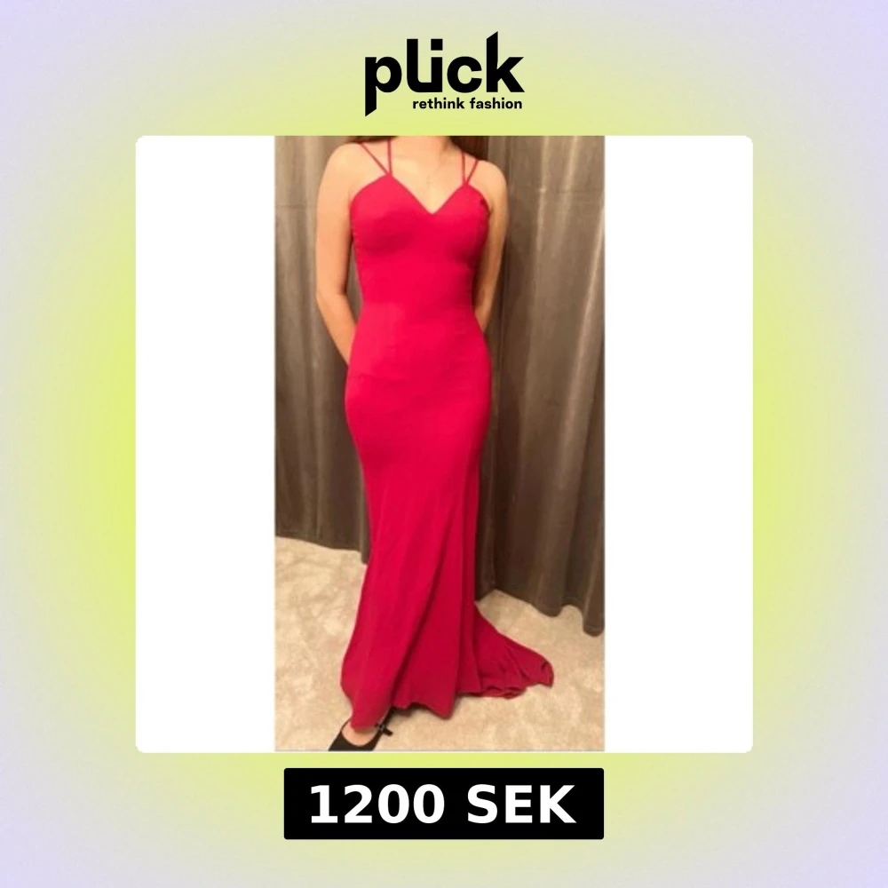 Säljer en snygg röd långklänning med smala axelband och v-ringning. Klänningen har en tight passform och öppen rygg med dekorativ snörning. Perfekt för dig som vill sticka ut på festen eller balen! Passar storlek S och ör justerbar i ryggen.