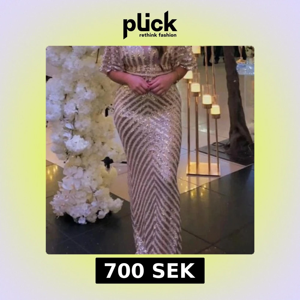 Säljer en glittrig långklänning i guld med paljetter och kort ärm. Klänningen har figurnära passform och ett elegant mönster av diagonala ränder. Perfekt för festliga tillfällen och bal.
