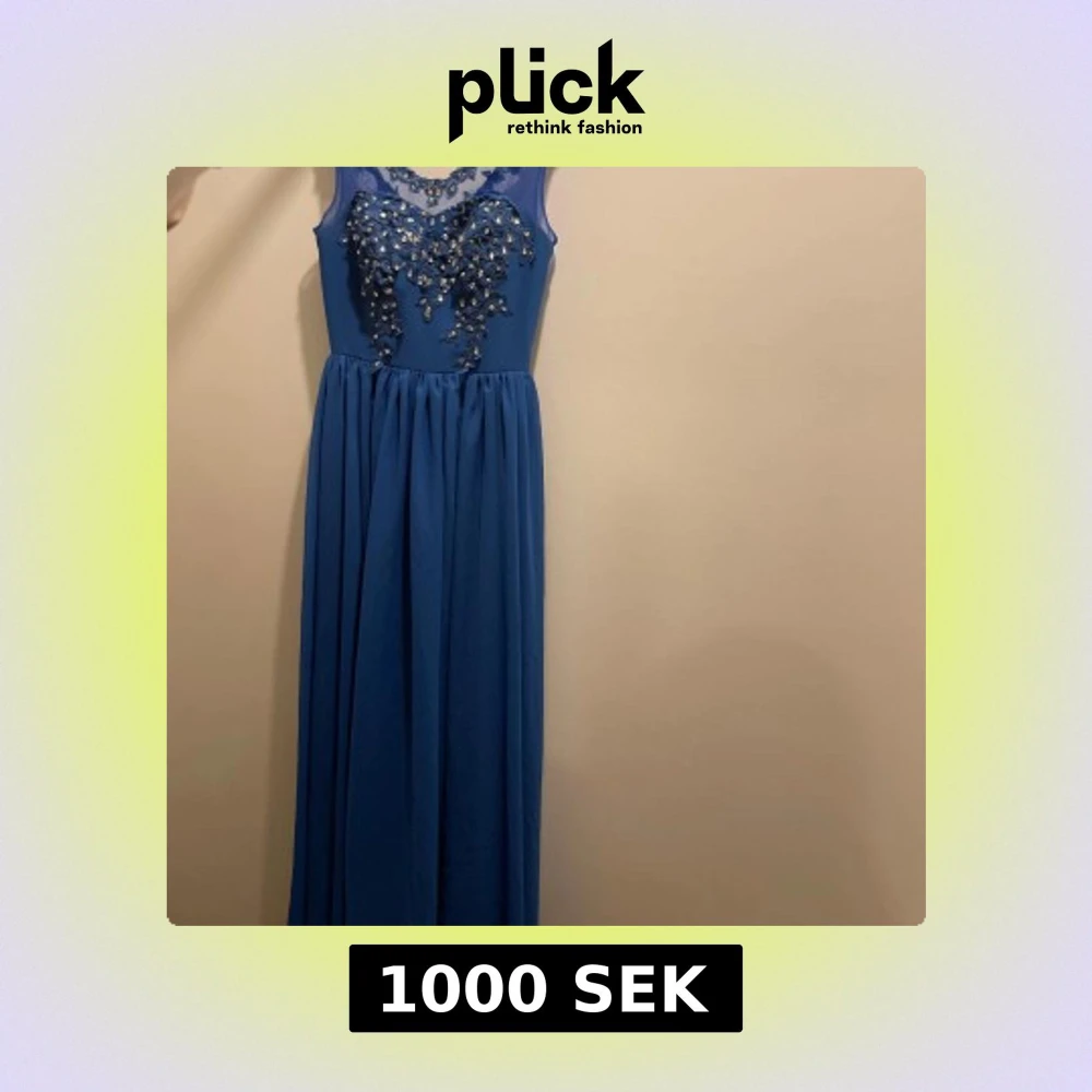 Säljer en blå långklänning med transparent mesh upptill, dekorerad med spetsapplikationer och glittrande pärlor framtill och baktill.