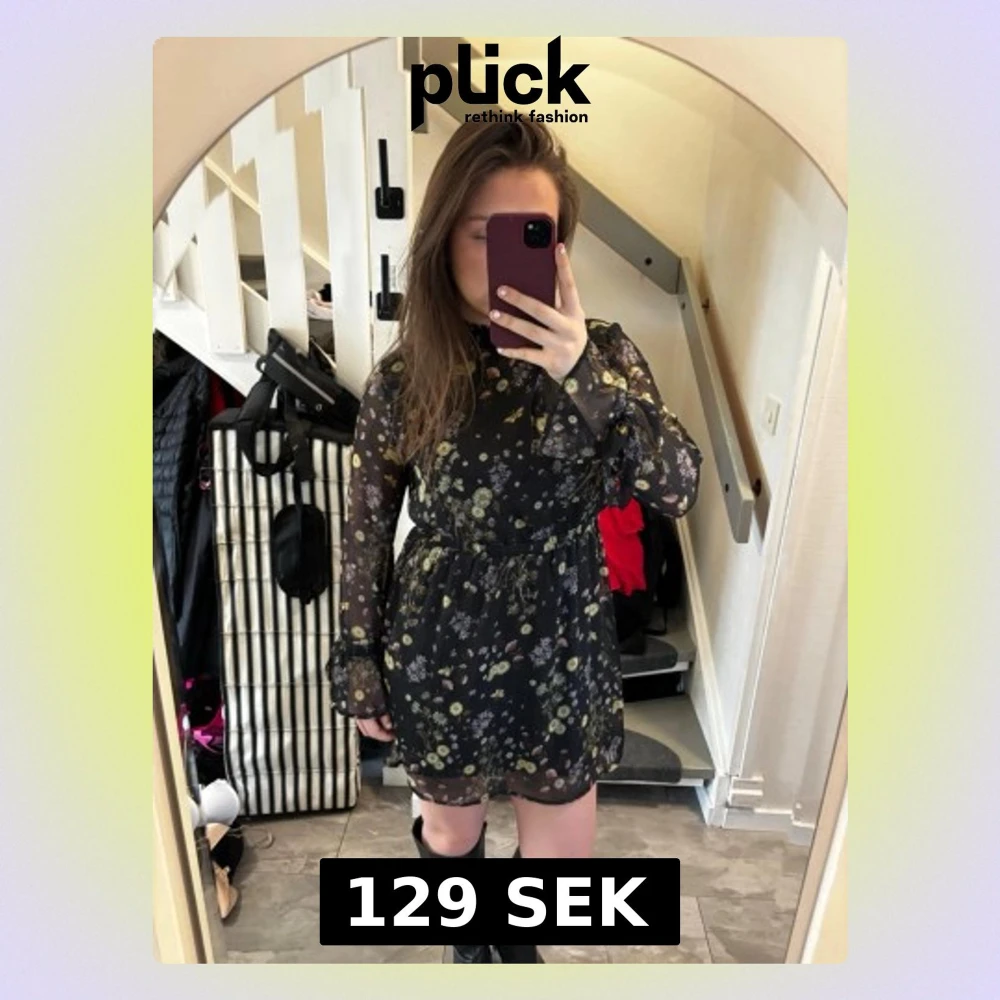 Snygg svart klänning med blommigt mönster och transparenta långärmar. Klänningen har volangdetaljer vid ärmslut och hals, samt markerad midja. Perfekt för dig som gillar en romantisk och trendig stil. Pris kan diskuteras💖