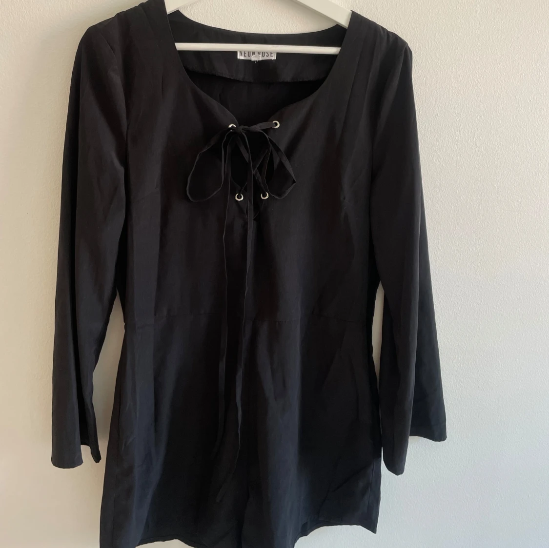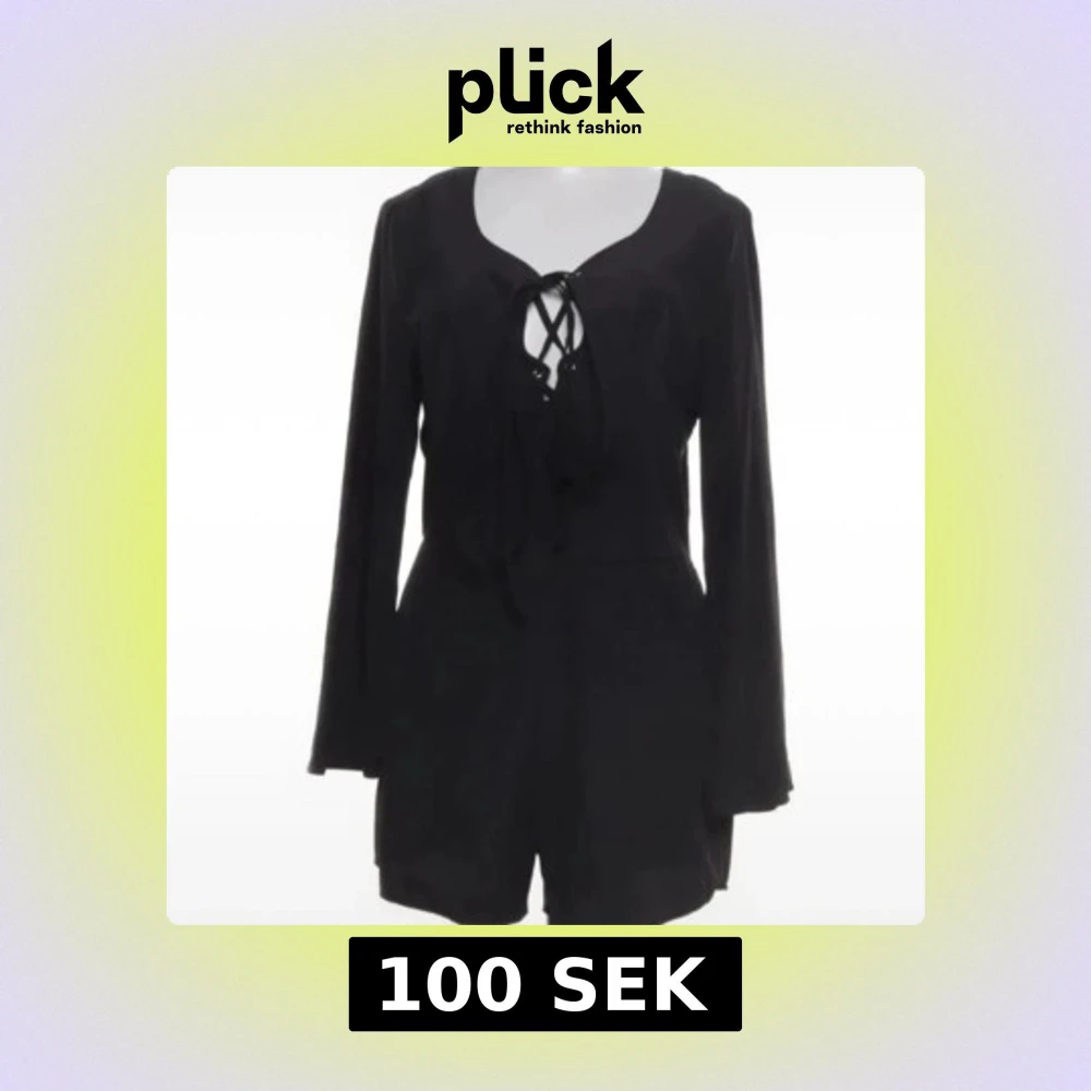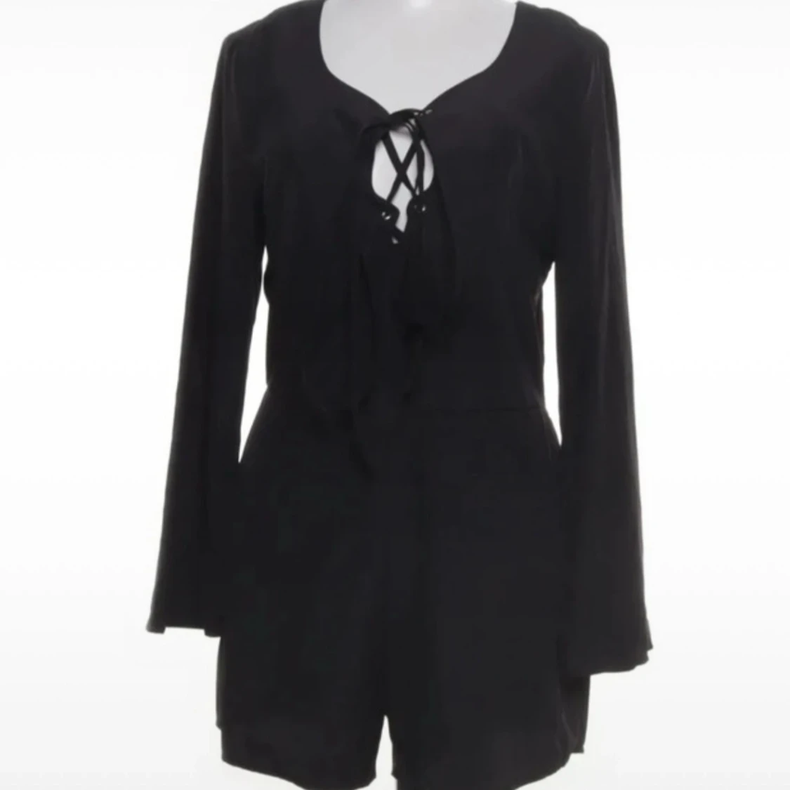 Snygg svart kort romper med långa ärmar och snörning framtill vid halsen. Den har en enkel och stilren design med lätt v-ringad hals och mjukt fallande tyg. Perfekt för dig som gillar minimalistisk stil med en twist.Romper / byxdress / shortsdress / playsuit från Neon Rose. Använd 1-2 gånger, mkt bra skick. Storlek 10, motsvarar 38