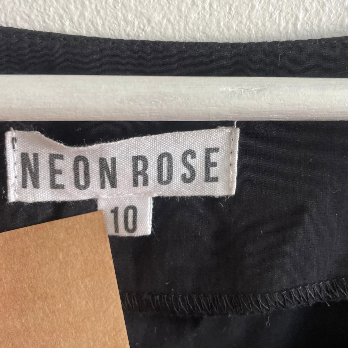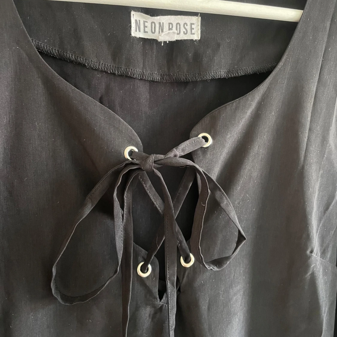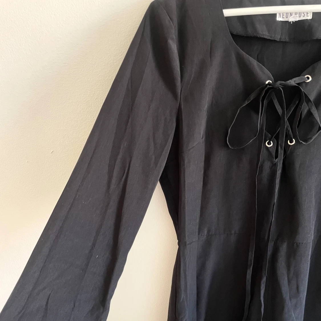 Snygg svart kort romper med långa ärmar och snörning framtill vid halsen. Den har en enkel och stilren design med lätt v-ringad hals och mjukt fallande tyg. Perfekt för dig som gillar minimalistisk stil med en twist.Romper / byxdress / shortsdress / playsuit från Neon Rose. Använd 1-2 gånger, mkt bra skick. Storlek 10, motsvarar 38