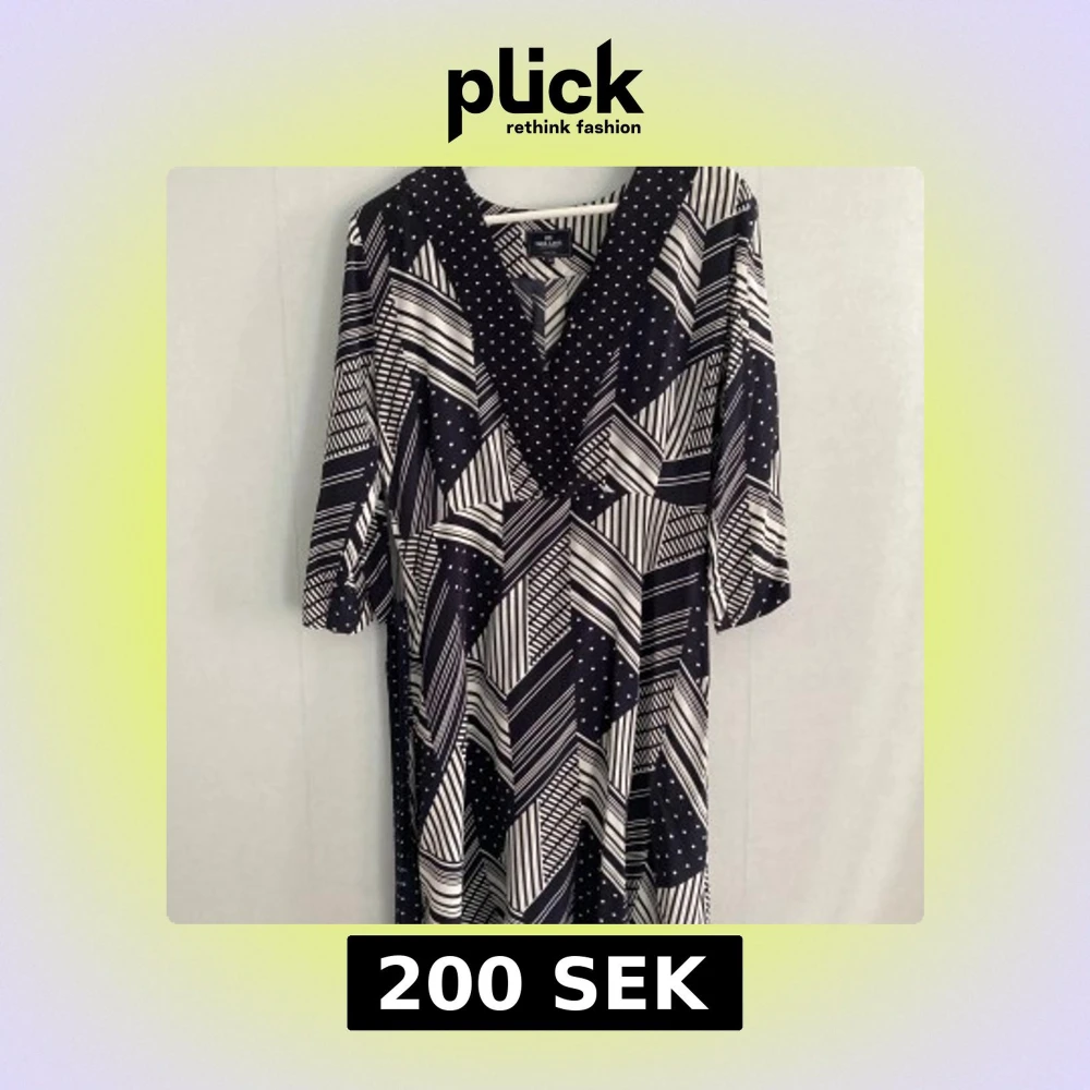 Snygg svartvit klänning från Park Lane med ett geometriskt mönster av ränder och prickar. Klänningen har en v-ringning och trekvartsärmar, perfekt för en stilren look. Passar bra till både vardag och festliga tillfällen.