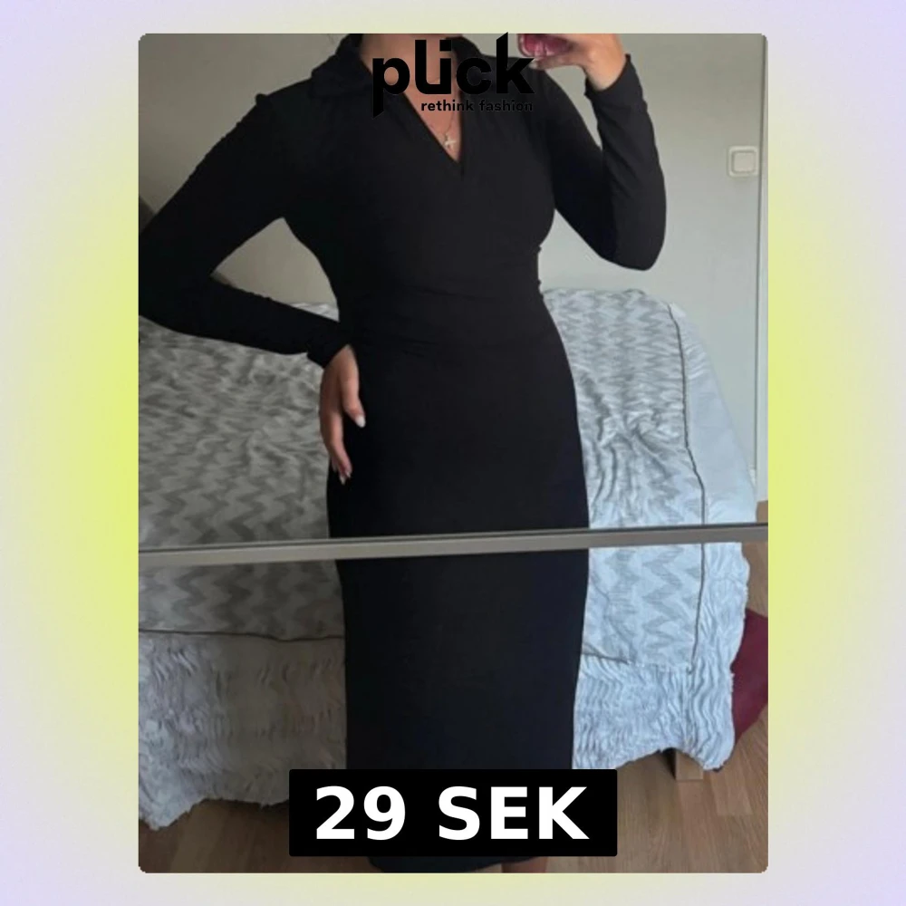 Snygg svart ribbad långklänning med lång ärm och krage. Klänningen har en v-ringad hals och figurnära passform som framhäver siluetten. Perfekt för dig som gillar stilrena och klassiska plagg. Kolla min profil för fler plagg! 🥰