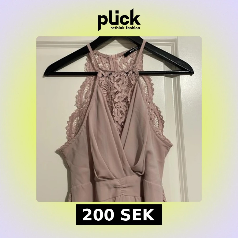 Elegant ljusrosa klänning med spetsdetaljer och omlott-design. Klänningen har en vacker spetsrygg och en subtil slits framtill. Perfekt för speciella tillfällen. Finns dessutom ett band som går att knyta till en vacker rosett!