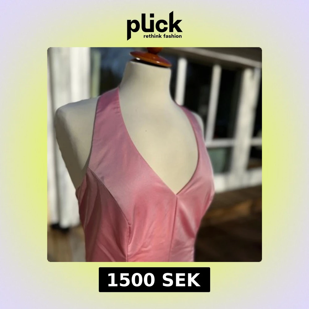 Säljer en elegant rosa långklänning med djup v-ringning och breda axelband. Klänningen har en figurnära överdel och utsvängd kjol med fina sömdetaljer. Perfekt för bal eller festliga tillfällen.