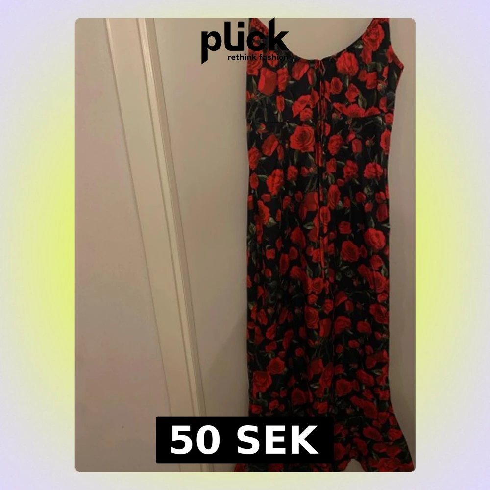 Svart långklänning med röda rosor och gröna blad i ett blommigt mönster. Klänningen har smala axelband och en lätt utställd nederdel. Perfekt för dig som vill sticka ut med en romantisk och färgstark look.
