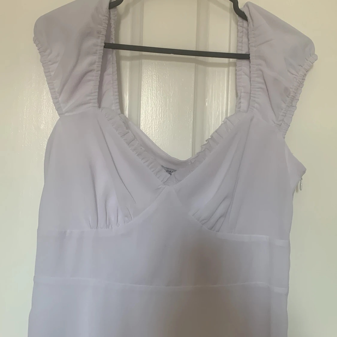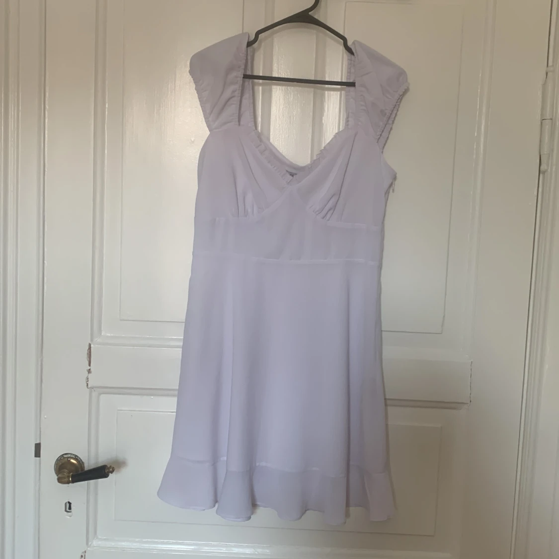 Supersöt vit kortklänning från Dame med v-ringning och breda axelband. Klänningen har volangkant nertill och är sydd i ett tunt, flowy material som ger en romantisk vibe. Perfekt för sommarens alla tillfällen! Köparen betalar frakten