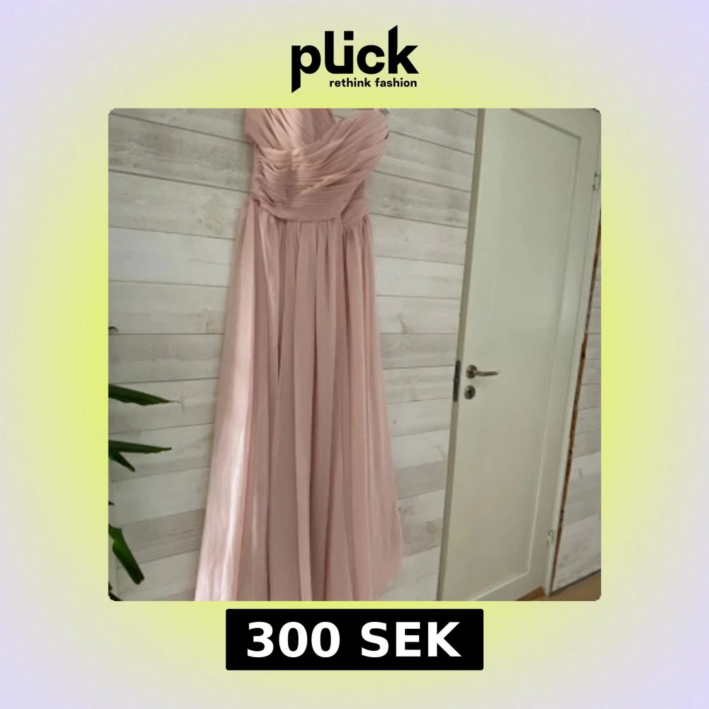 Säljer en ljusrosa långklänning med draperad, axelbandslös överdel och markerad midja. Kjolen är mjukt fallande och klänningen passar perfekt till bal eller fest. Klänningen är stl M men upplevs som en s när vi provar den så liten i stl.